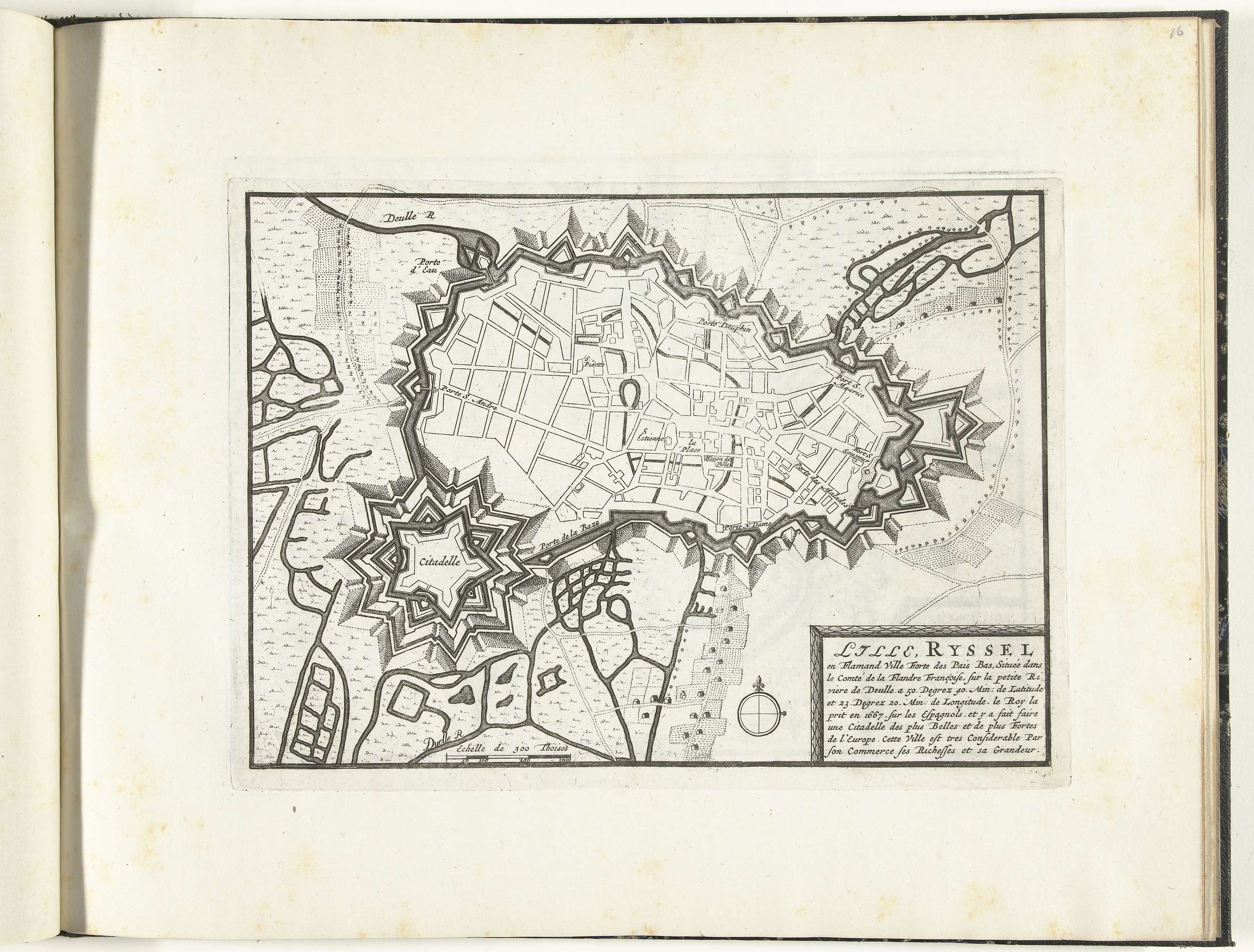 Plattegrond van de versterkingen om de Vlaamse stad Lille (Rijssel). Maakt deel uit van het eerste deel van het prentwerk: Le Theatre de la Guerre, dans les Pays-Bas, uitgegeven in 1696. Dit deel bevat 25 platen met plannen (afkomstig van Sébastien Le Prestre, Seigneur de Vauban) van vermaarde sterke steden en vestingen in de Negenjarige ...
