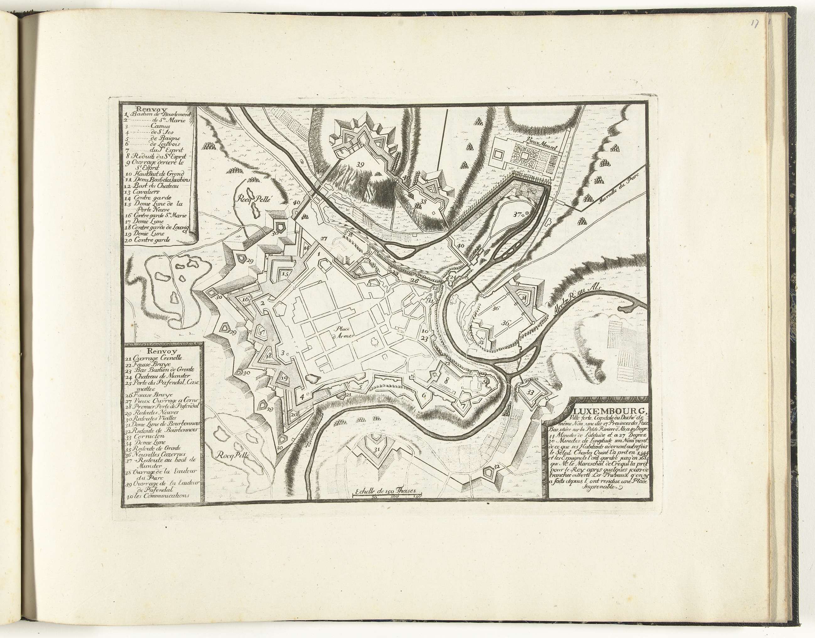Plattegrond van de versterkingen om de stad Luxemburg. Maakt deel uit van het eerste deel van het prentwerk: Le Theatre de la Guerre, dans les Pays-Bas, uitgegeven in 1696. Dit deel bevat 25 platen met plannen (afkomstig van Sébastien Le Prestre, Seigneur de Vauban) van vermaarde sterke steden en vestingen in de Negenjarige Oorlog in ...