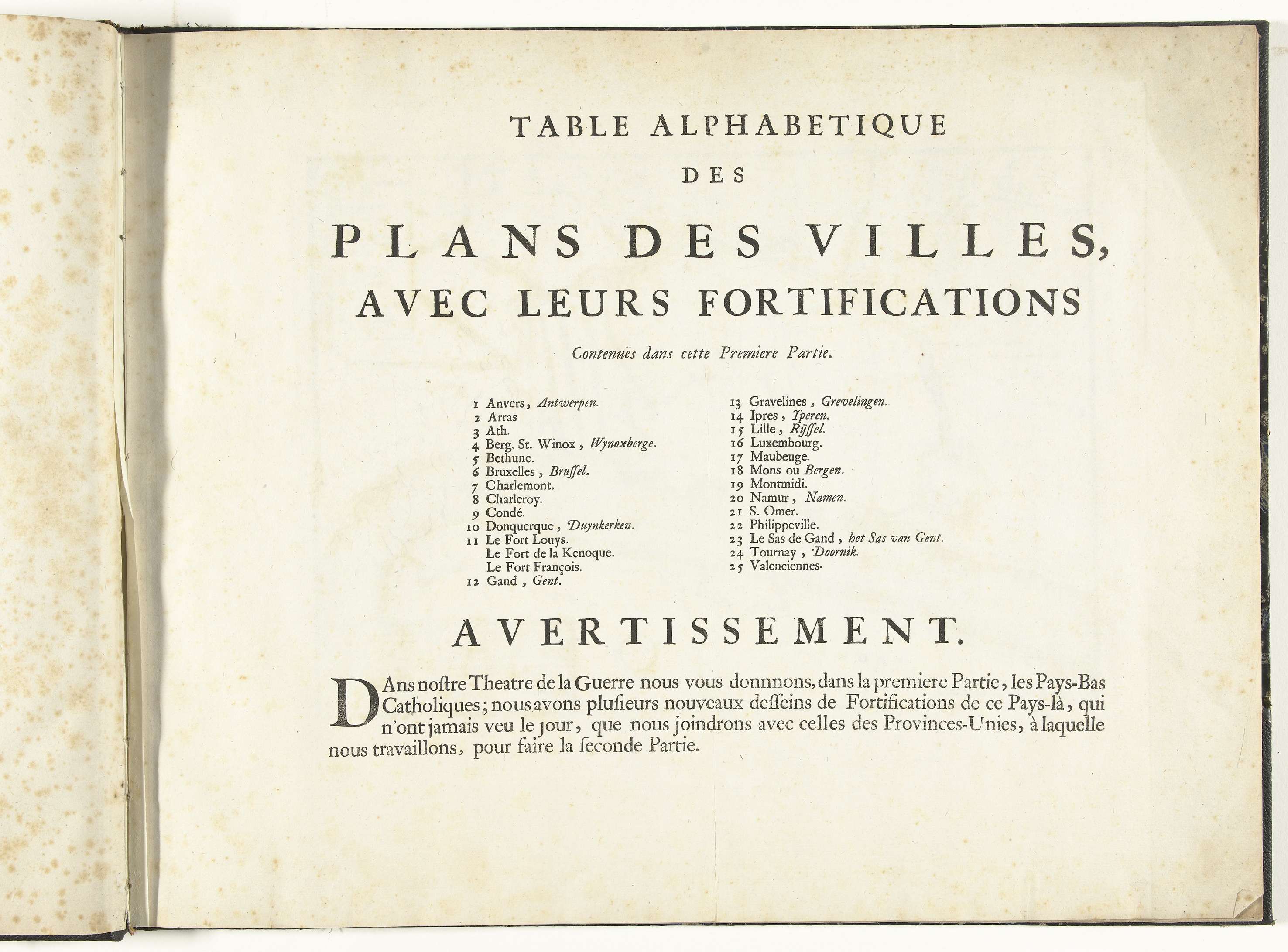 Inhoudsopgave voor het eerst deel van het prentwerk: Le Theatre de la Guerre, dans les Pays-Bas, 1696