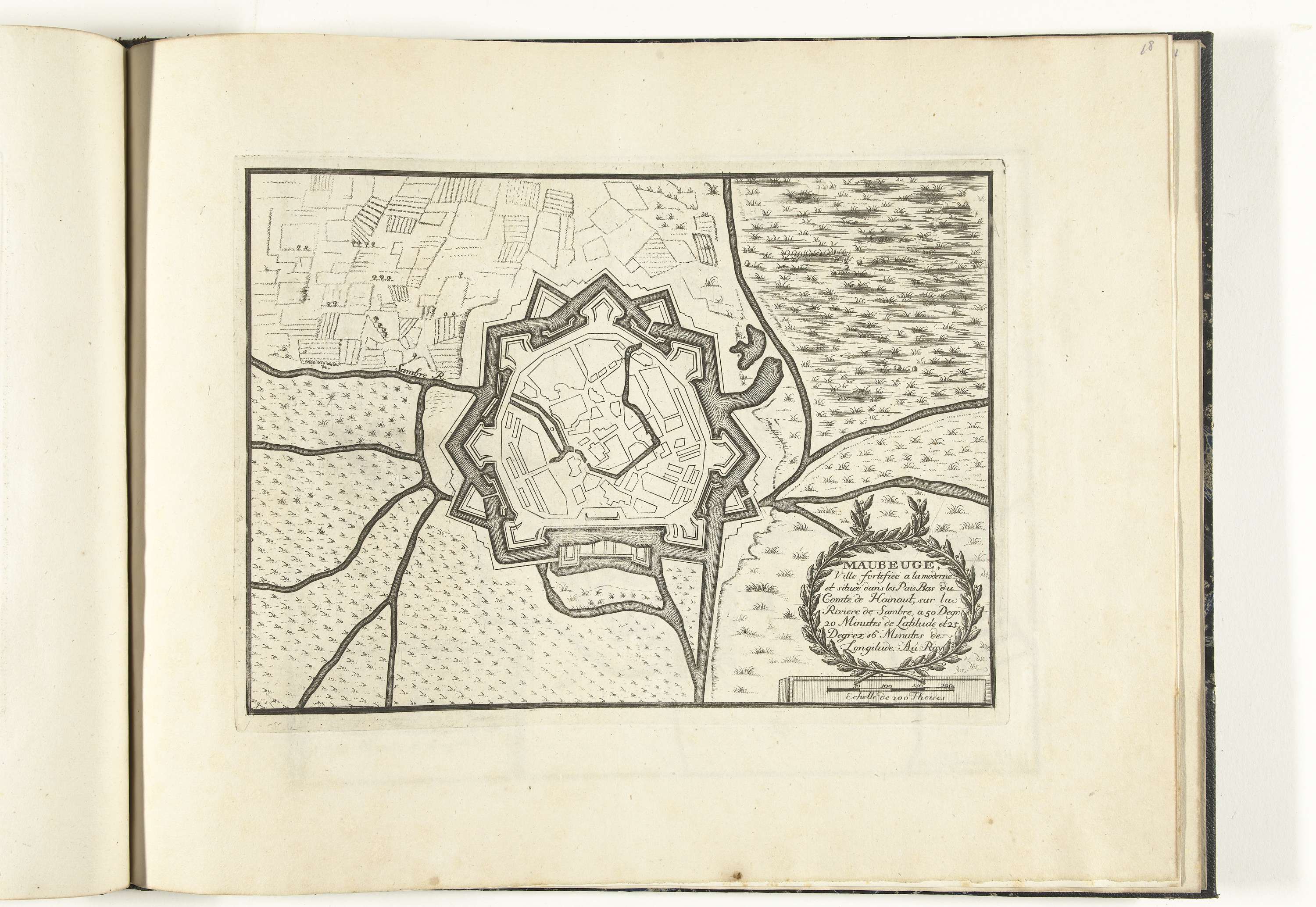 Plattegrond van de versterkingen om de stad Maubeuge in de graafschap Henegouwen. Maakt deel uit van het eerste deel van het prentwerk: Le Theatre de la Guerre, dans les Pays-Bas, uitgegeven in 1696. Dit deel bevat 25 platen met plannen (afkomstig van Sébastien Le Prestre, Seigneur de Vauban) van vermaarde sterke steden en vestingen in ...