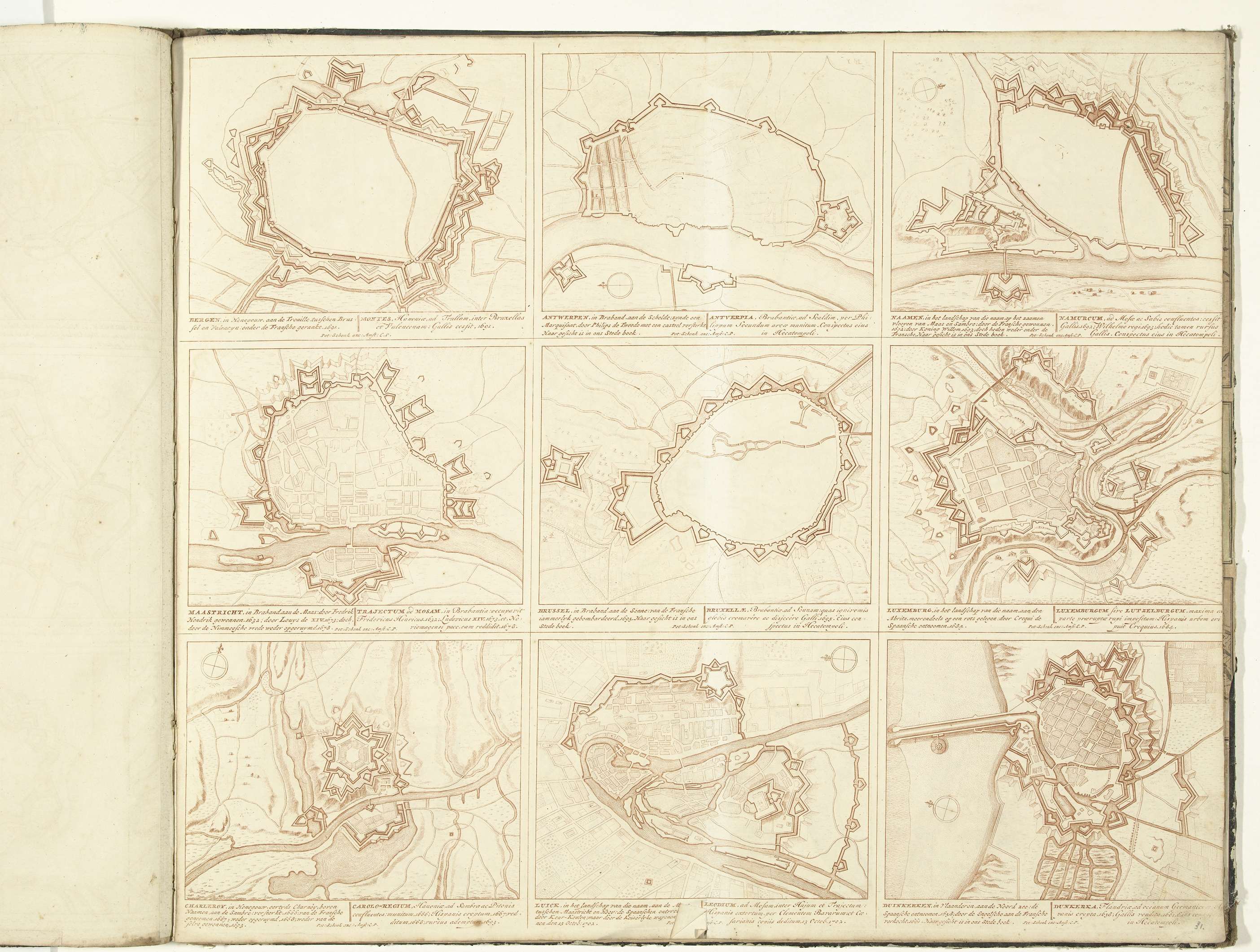 Blad met negen plattegronden van de versterkingen van steden in de Spaanse Nederlanden. Blad XXXI in: Schouwburg van den oorlog (editie van 1709), het prentwerk met de gebundelde reeks van 18 platen over de Spaanse Successieoorlog.