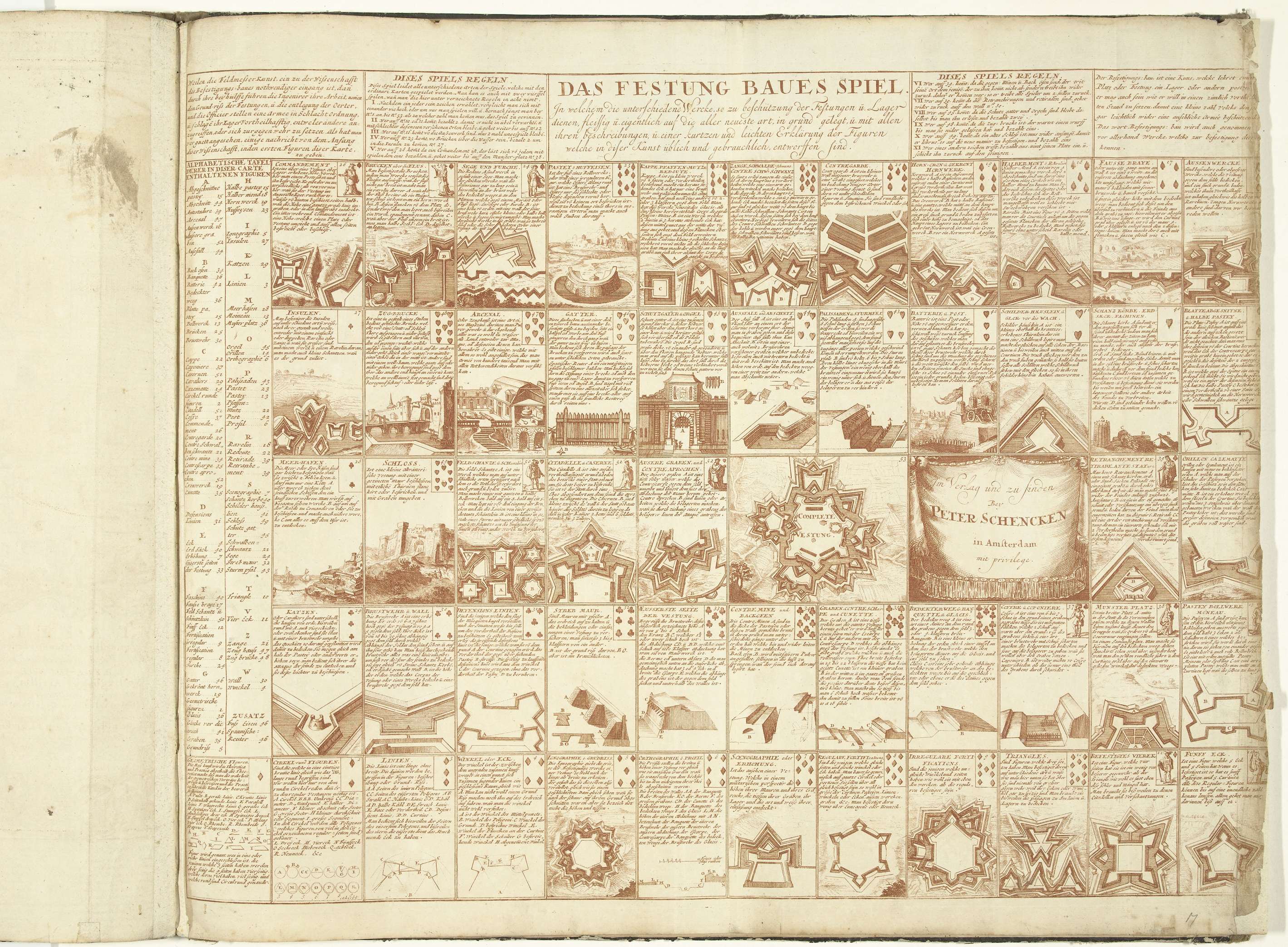 Het vestingbouwspel. Blad met een bordspel met 52 vakken, elk vak met een speelkaart en een element uit de vestingbouw. Wanneer de speler alle 52 vakken heeft doorlopen bezit hij een complete vesting. Opschriften in de plaat in het Duits. Blad XXXIIIb in: Schouwburg van den oorlog (editie van 1709), het prentwerk met de gebundelde ...