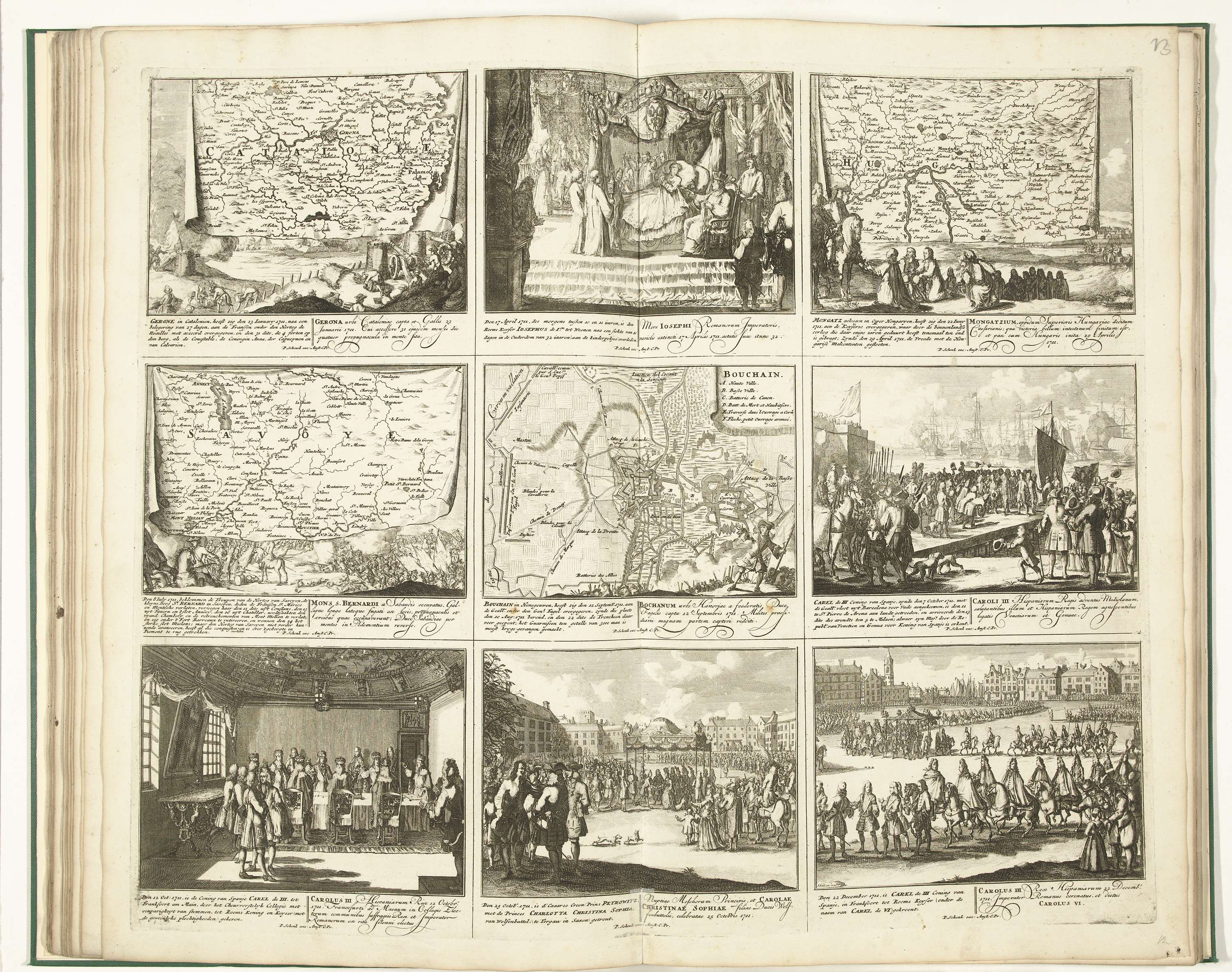 Blad met negen voorstellingen van gebeurtenissen uit het jaar 1711 van de Spaanse Successieoorlog en van plattegronden van versterkte steden. Blad XII in: Schouwburg van den oorlog (editie van 1720), het prentwerk met de gebundelde reeks van 31 platen over de Spaanse Successieoorlog.
