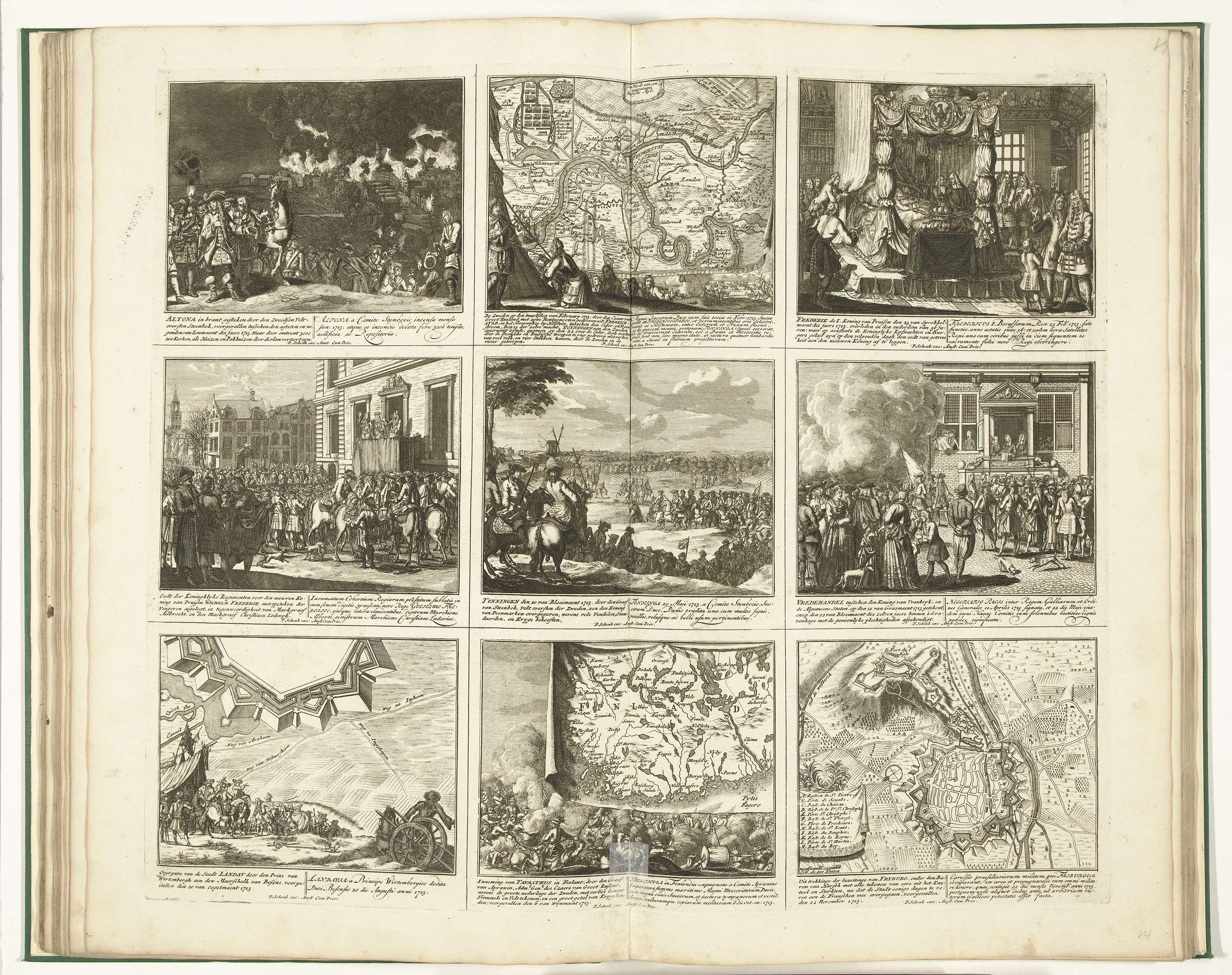 Blad met negen voorstellingen van gebeurtenissen uit het jaar 1713 van de Spaanse Successieoorlog en van plattegronden van versterkte steden. Blad XIV in: Schouwburg van den oorlog (editie van 1720), het prentwerk met de gebundelde reeks van 31 platen over de Spaanse Successieoorlog.