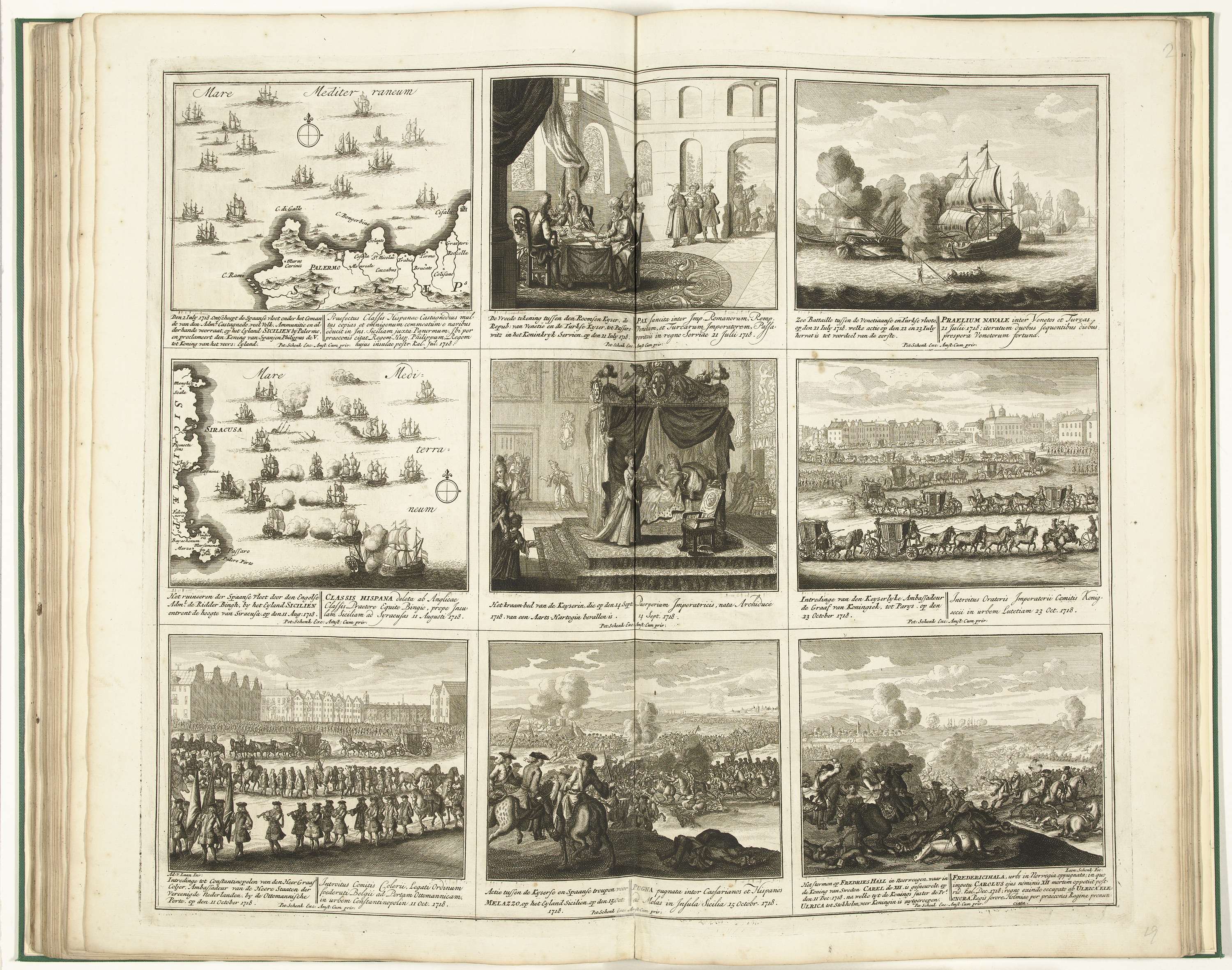 Blad met negen voorstellingen van gebeurtenissen uit het jaar 1718 in de oorlog tegen de Turken (1716-1718) en in de Spaanse Successieoorlog. Blad XIX in: Schouwburg van den oorlog (editie van 1720), het prentwerk met de gebundelde reeks van 31 platen over de Spaanse Successieoorlog.