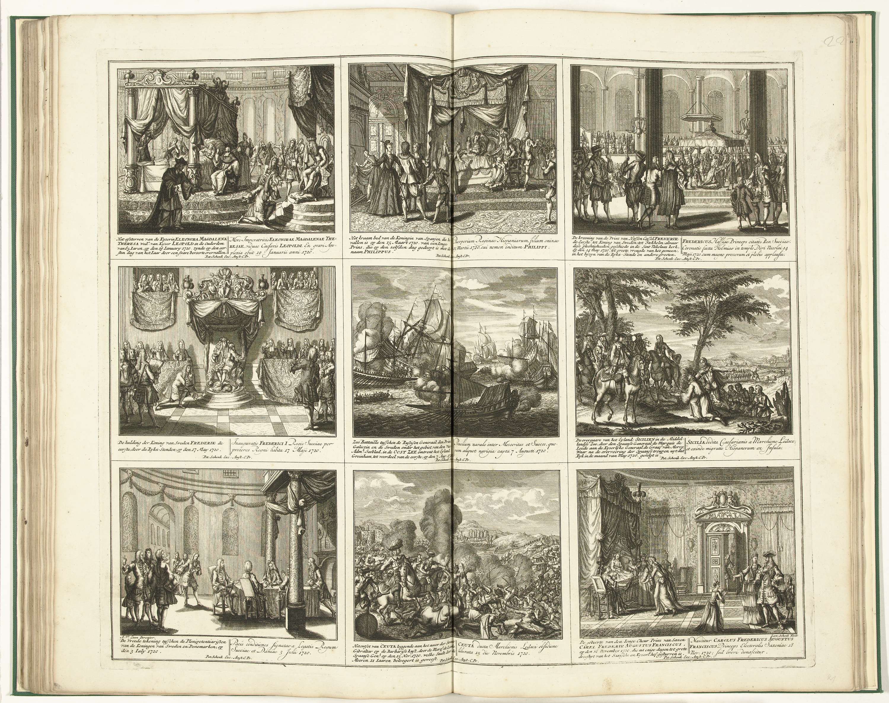 Blad met negen voorstellingen van gebeurtenissen uit het jaar 1720. Blad XXI in: Schouwburg van den oorlog (editie van 1720), het prentwerk met de gebundelde reeks van 31 platen over de Spaanse Successieoorlog.