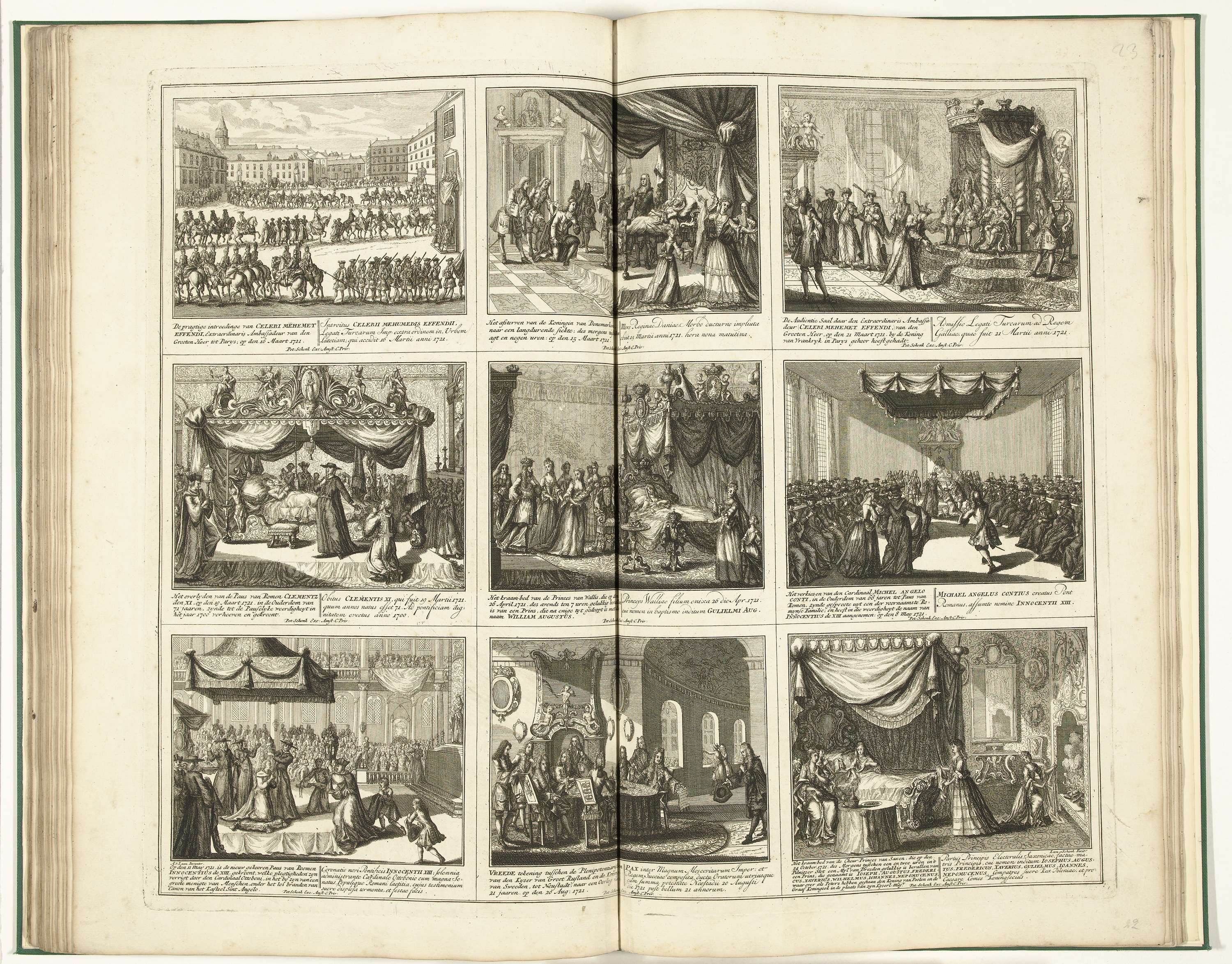 Blad met negen voorstellingen van gebeurtenissen uit het jaar 1721. Blad XXII in: Schouwburg van den oorlog (editie van 1720), het prentwerk met de gebundelde reeks van 31 platen over de Spaanse Successieoorlog.