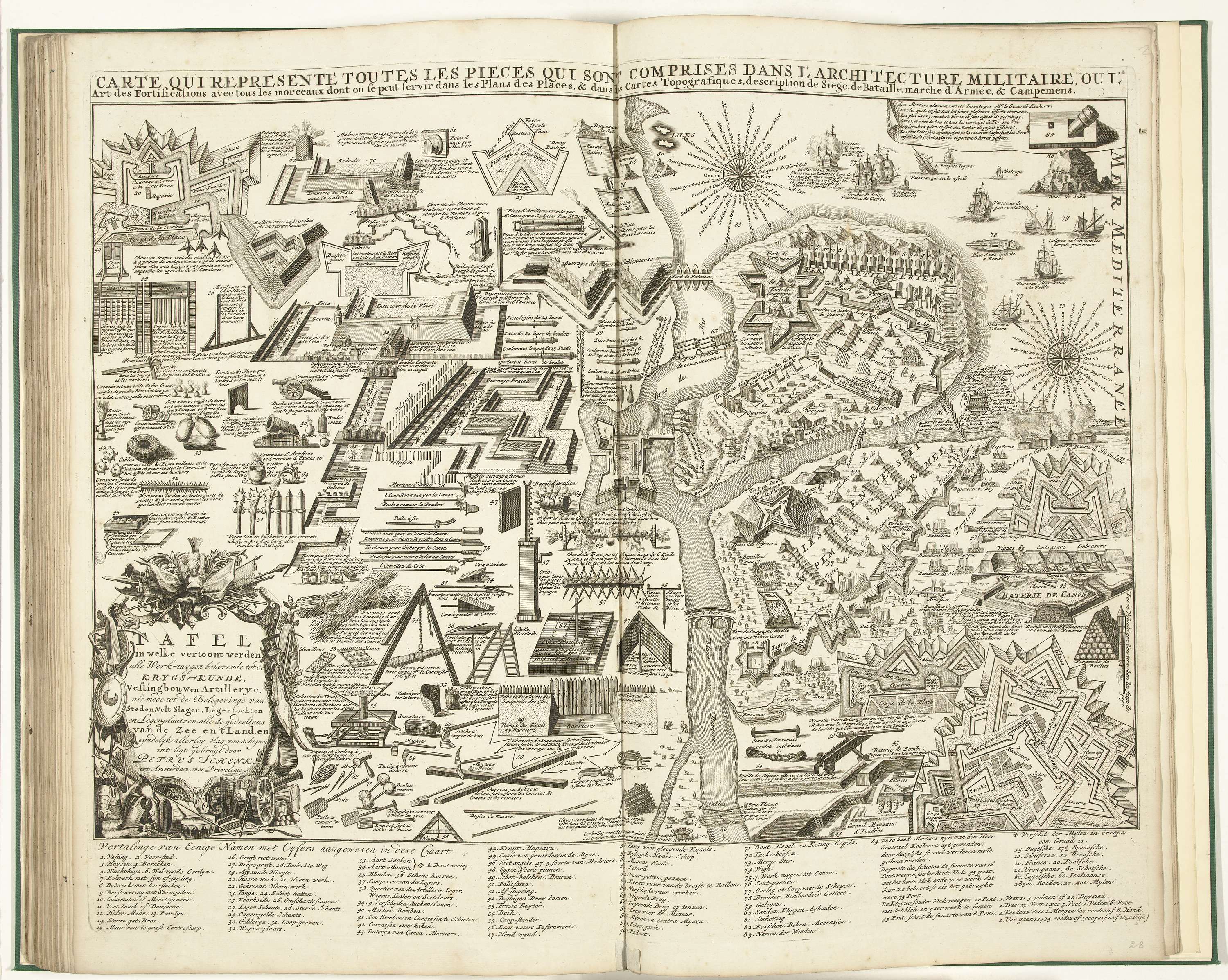 Blad met een overzicht van allerlei soorten werktuigen en wapens gebruikt in de vestingbouw, diagrammen en doorsneden van vestingen, typen legerkampen, soorten schepen etc, 1703. Opschriften in de voorstelling in het Frans, onderaan de legenda 1-84 in het Nederlands. Blad XXXIII in: Schouwburg van den oorlog (editie van 1720), het prentwerk met de gebundelde reeks ...