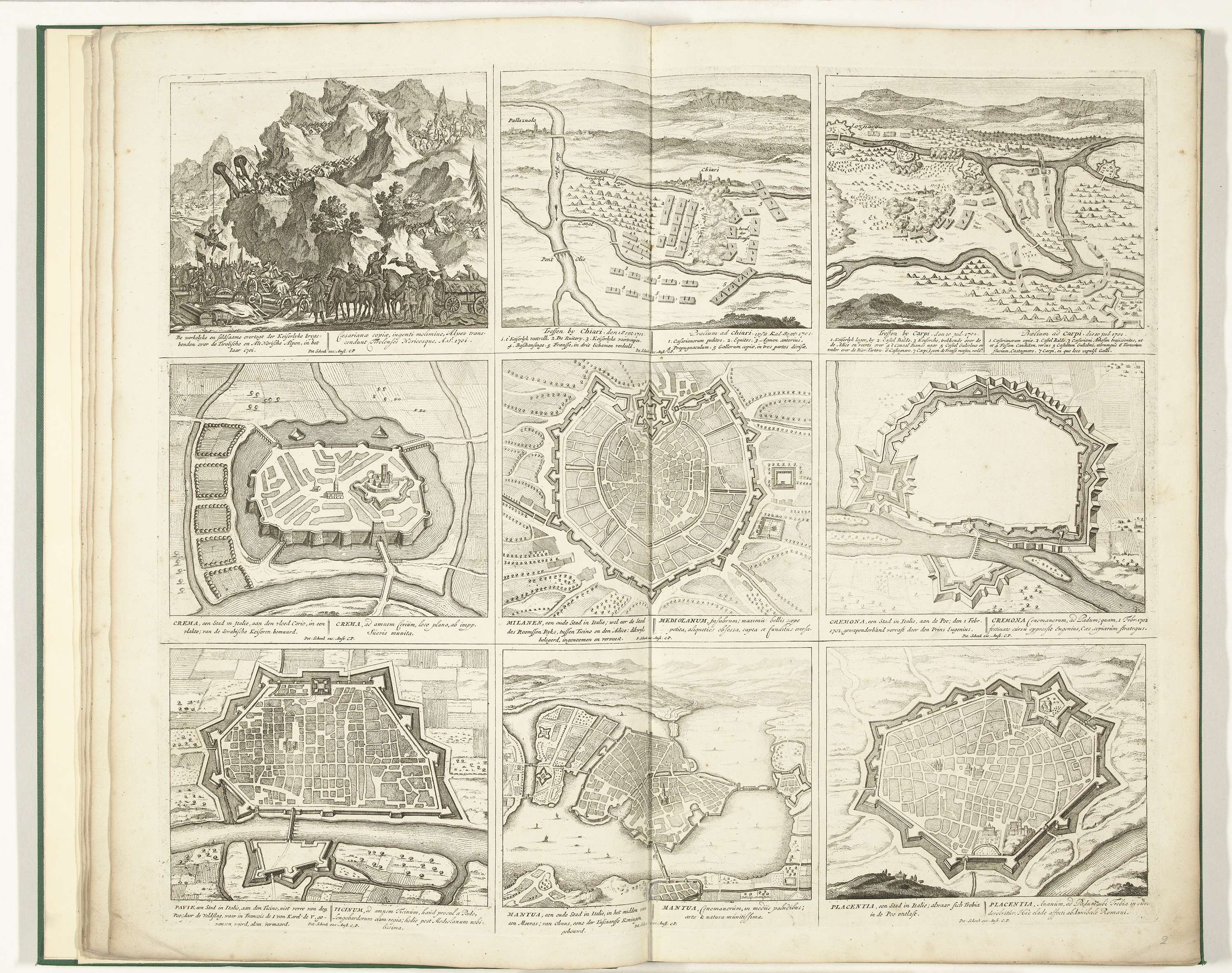 Blad met drie voorstellingen van gebeurtenissen uit de jaren 1701-1702 van de Spaanse Successieoorlog en zes plattegronden van versterkte steden in Italië. Blad II in: Schouwburg van den oorlog (editie van 1720), het prentwerk met de gebundelde reeks van 31 platen over de Spaanse Successieoorlog.