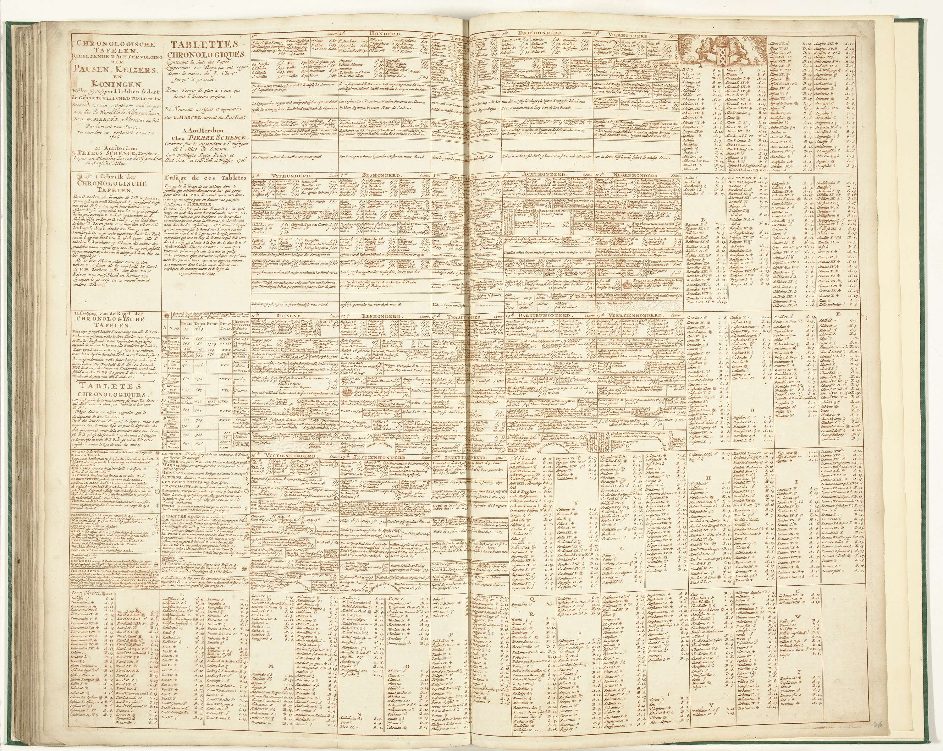 Blad met chronologische lijsten van de pausen en wereldlijke vorsten vanaf het jaar nul tot 1706. Het blad bevat alleen tekst, geen voorstelling, alle opschriften in het Nederlands. Blad XXXVI in: Schouwburg van den oorlog (editie van 1720), het prentwerk met de gebundelde reeks van 31 platen over de Spaanse Successieoorlog.