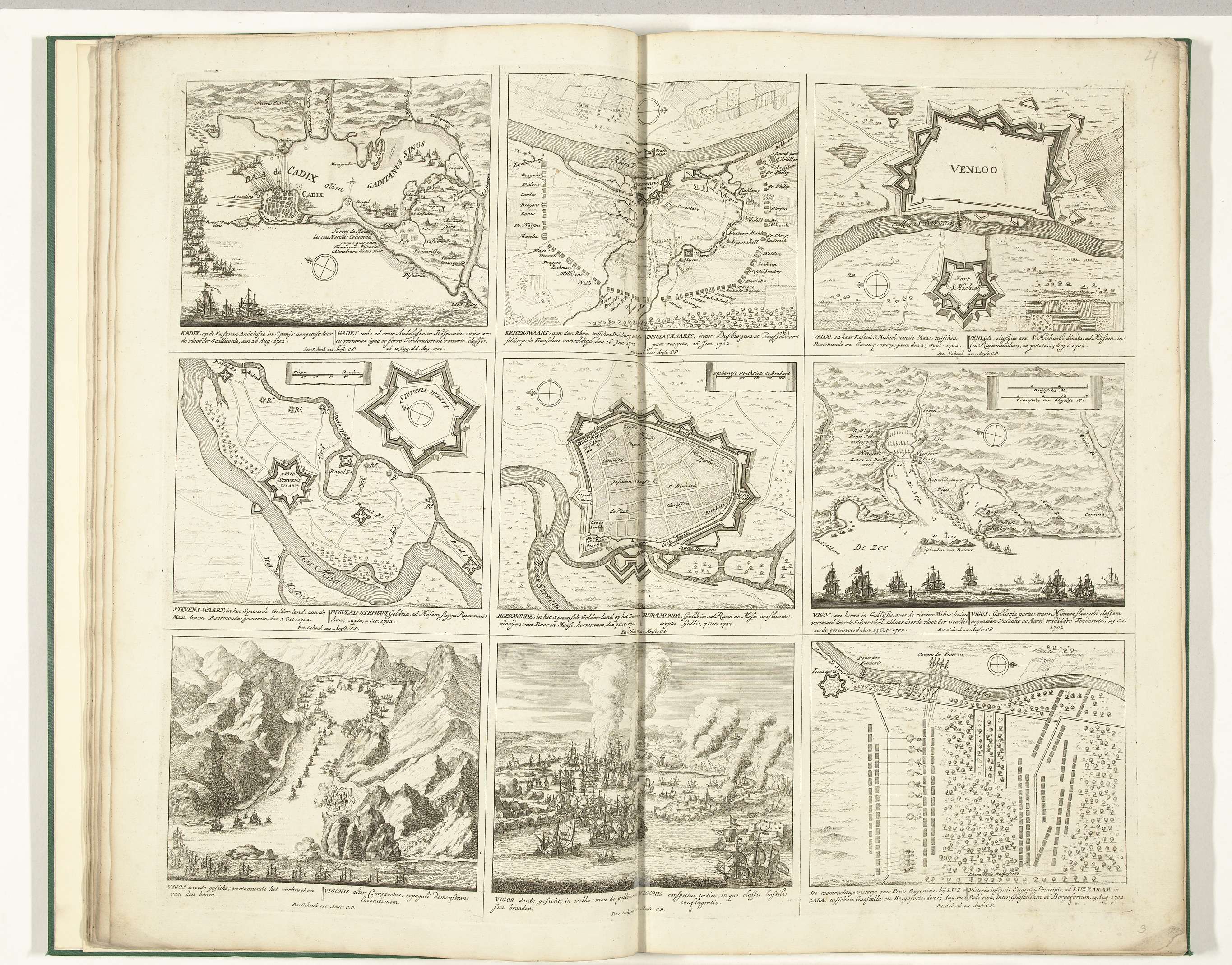 Blad met negen voorstellingen van gebeurtenissen uit het jaar 1702 van de Spaanse Successieoorlog en van plattegronden van versterkte steden. Blad III in: Schouwburg van den oorlog (editie van 1720), het prentwerk met de gebundelde reeks van 31 platen over de Spaanse Successieoorlog.