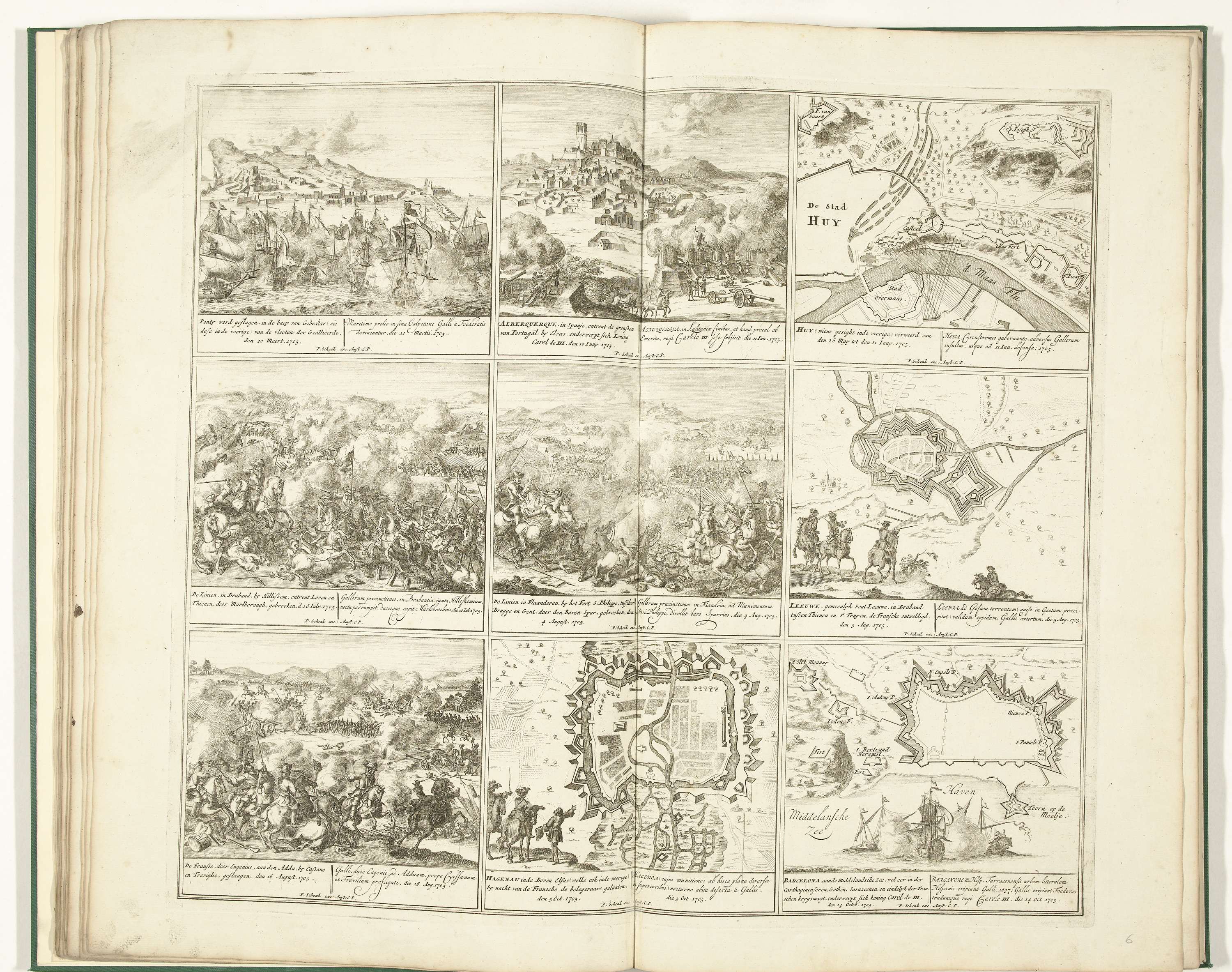Blad met negen voorstellingen van gebeurtenissen uit het jaar 1705 van de Spaanse Successieoorlog en van plattegronden van versterkte steden. Blad VI in: Schouwburg van den oorlog (editie van 1720), het prentwerk met de gebundelde reeks van 31 platen over de Spaanse Successieoorlog.