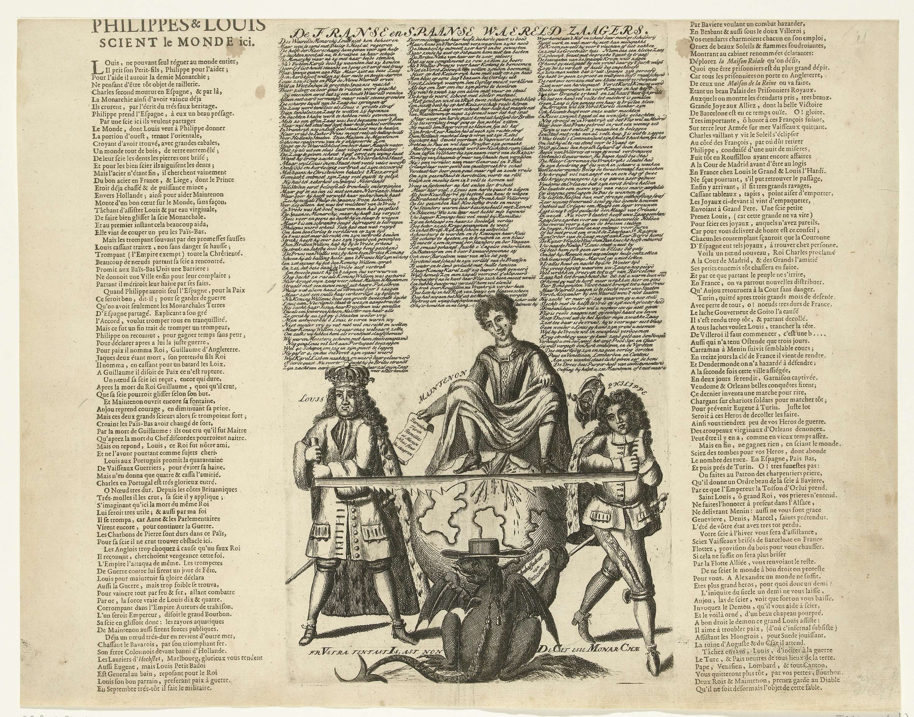 Spotprent op Lodewijk XIV en Filips V die met een grote zaag de wereld in tweeën proberen te zagen. Bovenop de wereldbol zit Madame de Maintenon die op de zaag plast om het blad te smeren. Op de voorgrond een duivel met kardinaalshoed. Spotprent op de situatie in het jaar 1706 in de Spaanse Successieoorlog. ...