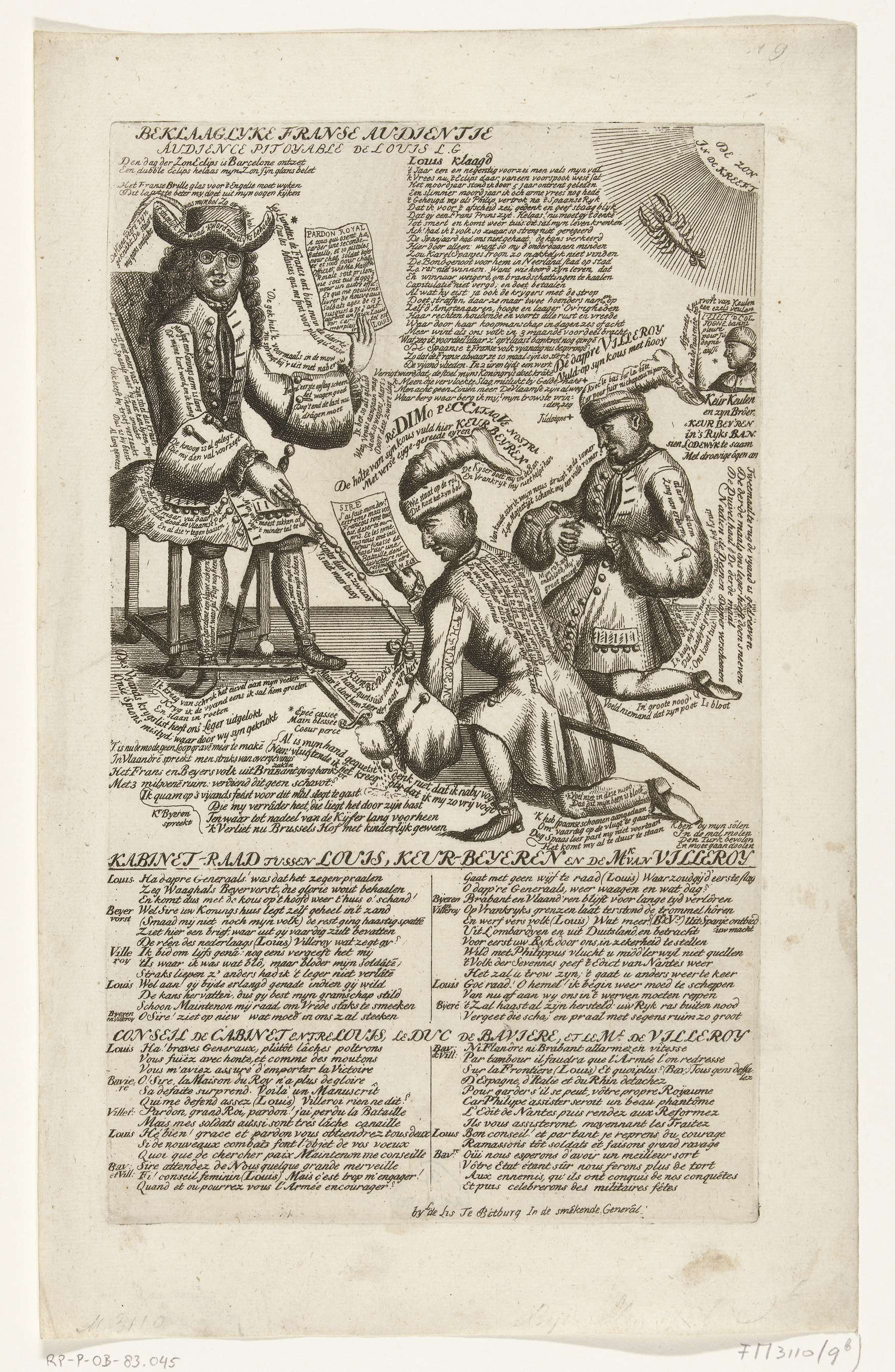 De hertog van Villeroy en Maximiliaan II Emanuel, de keurvorst van Beieren, knielen met de kous op de kop voor koning Lodewijk XIV, 1706. In de plaat verzen in het Nederlands en Frans. Spotprent op de situatie in het jaar 1706 in de Spaanse Successieoorlog. Onderdeel van een reeks van 25 spotprenten op de Fransen ...