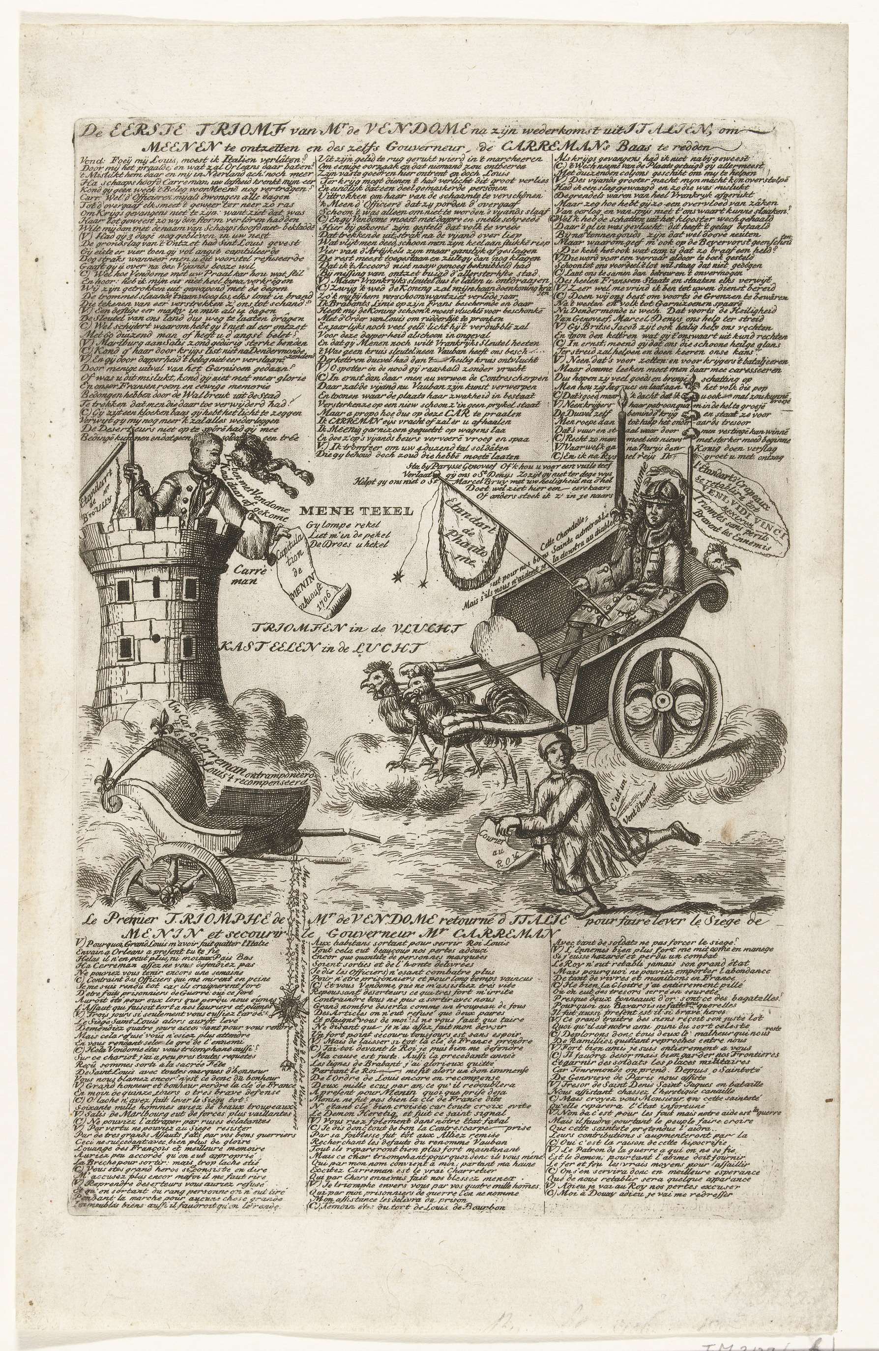 Spotprent op het verlies van Menen en de komst van de hertog van Vendôme vanuit Italië naar Brabant, 1706. Carremans, de bevelhebber te Menen, staande op een toren beklaagt de overgave van de stad op 22 augustus 1706. Vendôme in een strijdwagen getrokken door Franse hanen. In de plaat verzen in het Nederlands en Frans. ...