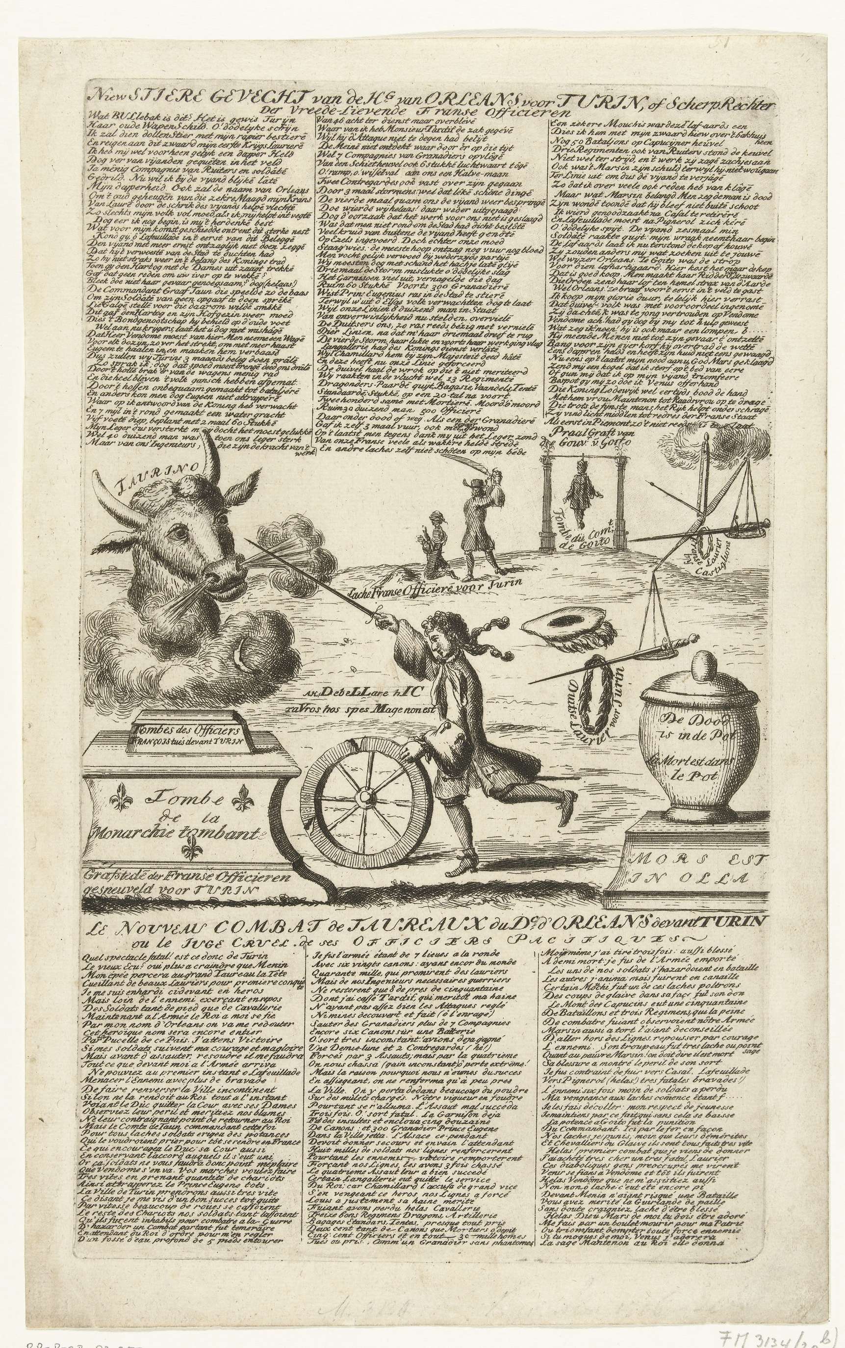 Spotprent op het mislukte Franse beleg van Turijn, ontzet door de geallieerden op 7 september 1706. De Franse bevelhebber Filips II, hertog van Orléans, speelt met een hoepel, links een briesende stierenkop. Op de achtergrond terechtstellingen van Franse officieren. In de plaat verzen in het Nederlands en Frans. Spotprent op de situatie in het jaar ...