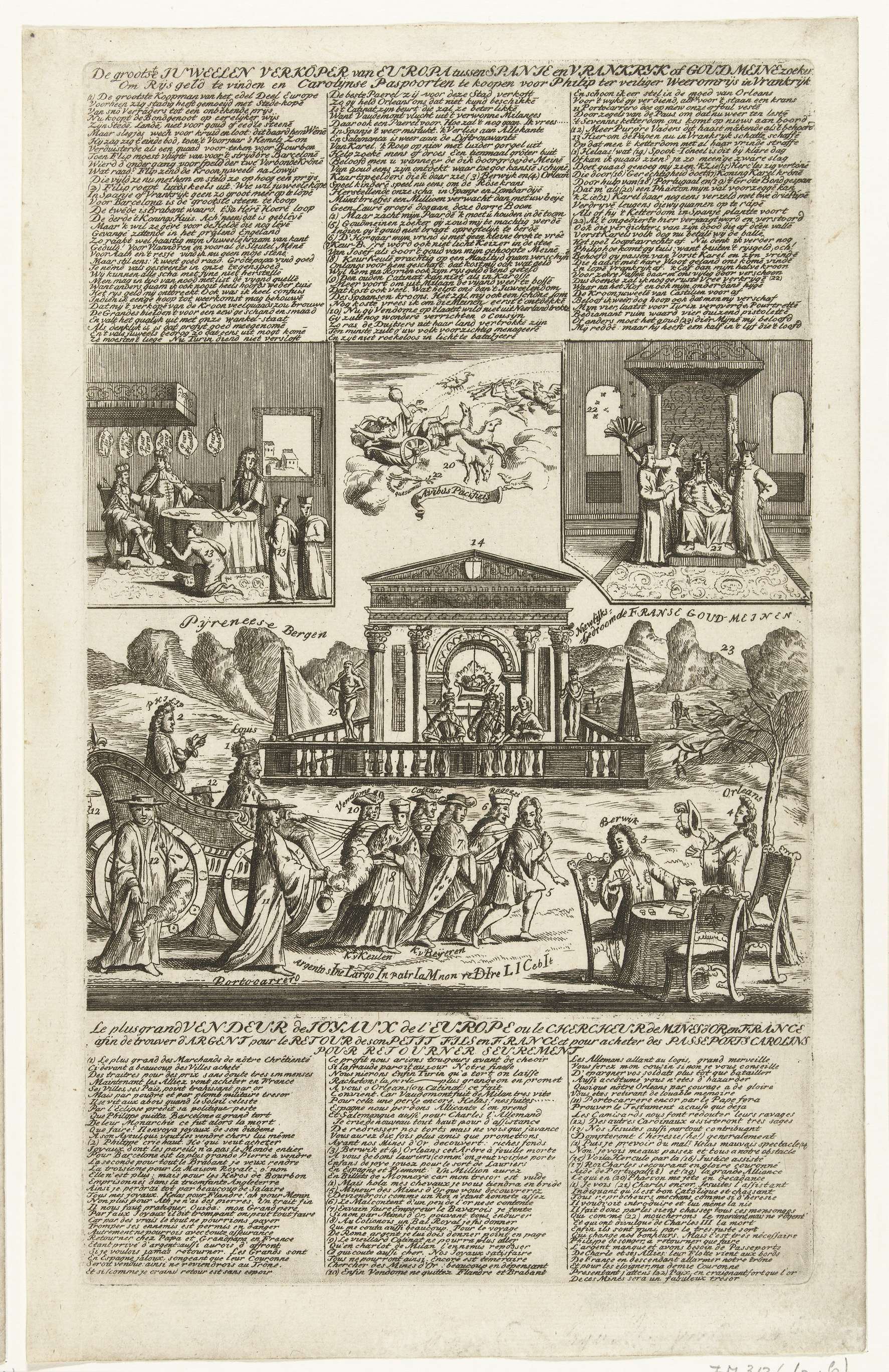 Triomfwagen met Lodewijk XIV en de hertog van Anjou door zes vorsten getrokken in de richting van een tempel waar de Spaanse kroon bewaard wordt. Bovenaan twee cartouches met voorstellingen met jezuïeten, 1706. In de plaat verzen in het Nederlands en Frans. Spotprent op de situatie in het jaar 1706 in de Spaanse Successieoorlog. Onderdeel ...