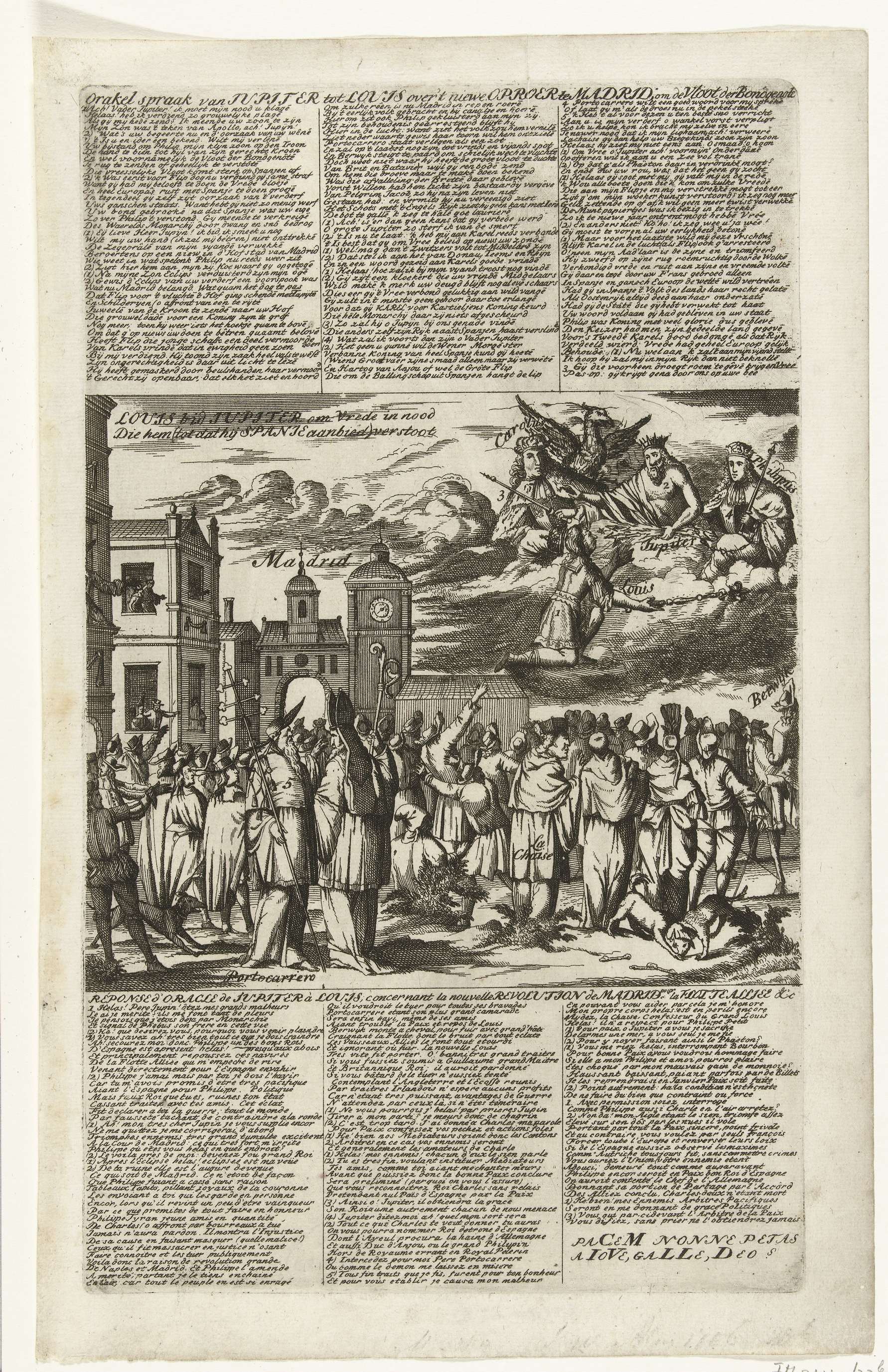 Jupiter verschijnt aan de hemel samen met aartshertog Karel van Oostenrijk en Filips V aan een publiek te Madrid, 10 mei 1706. Lodewijk XIV knielt voor Jupiter. De god vraagt de aanwezigen welke vorst zij als koning willen. In de plaat verzen in het Nederlands en Frans. Spotprent op de situatie in het jaar 1706 ...