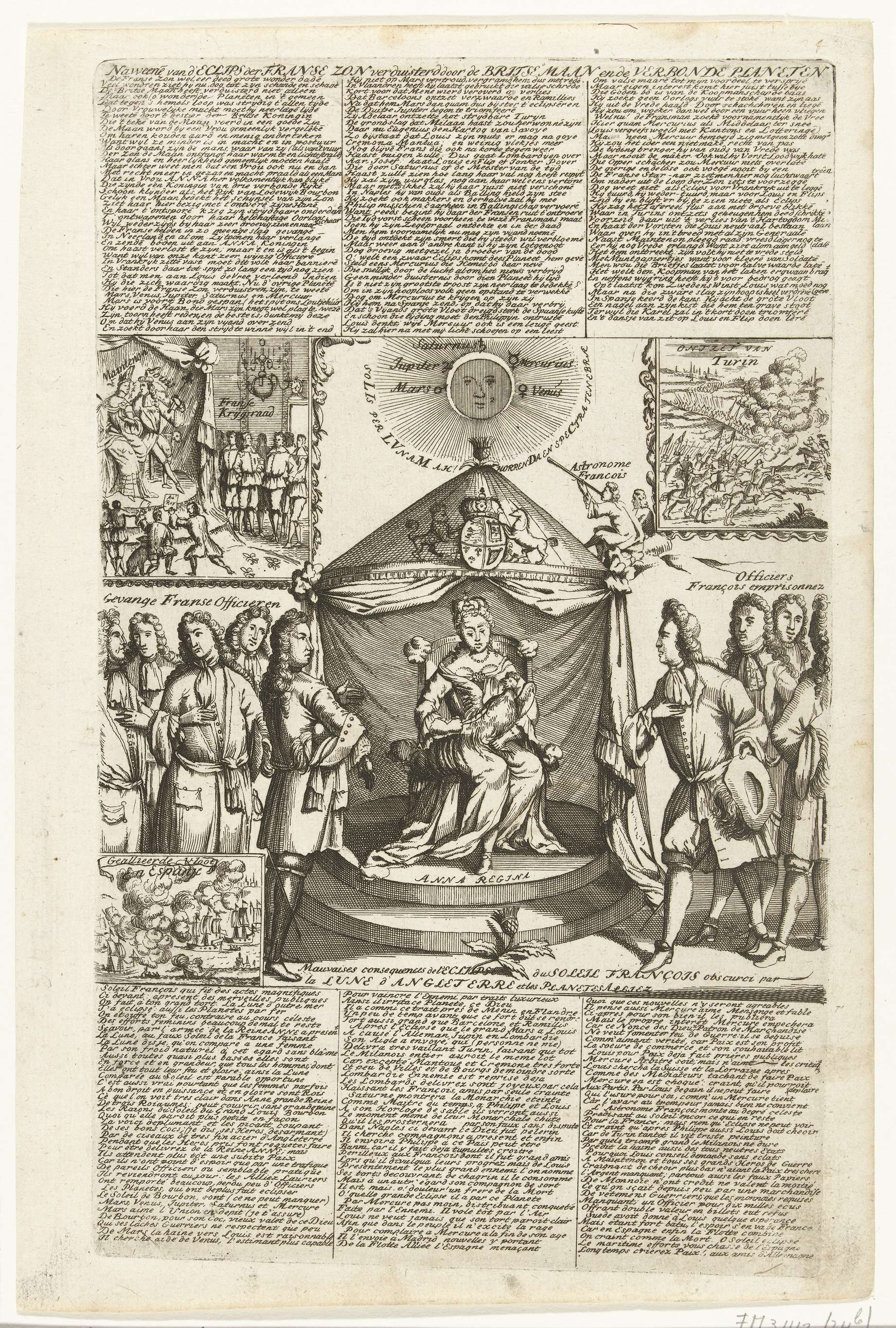 Spotprent waarin de Engelse koningin Anna gezeten op haar troon de Franse haan plukt, aan weerszijden gevangen Franse officieren. Boven de troon de zonsverduistering van 12 mei 1706. Met drie kleine scènes van de Franse nederlagen en Lodewijk XIV samen met Madame de Maintenon op de troon. In de plaat verzen in het Nederlands en ...