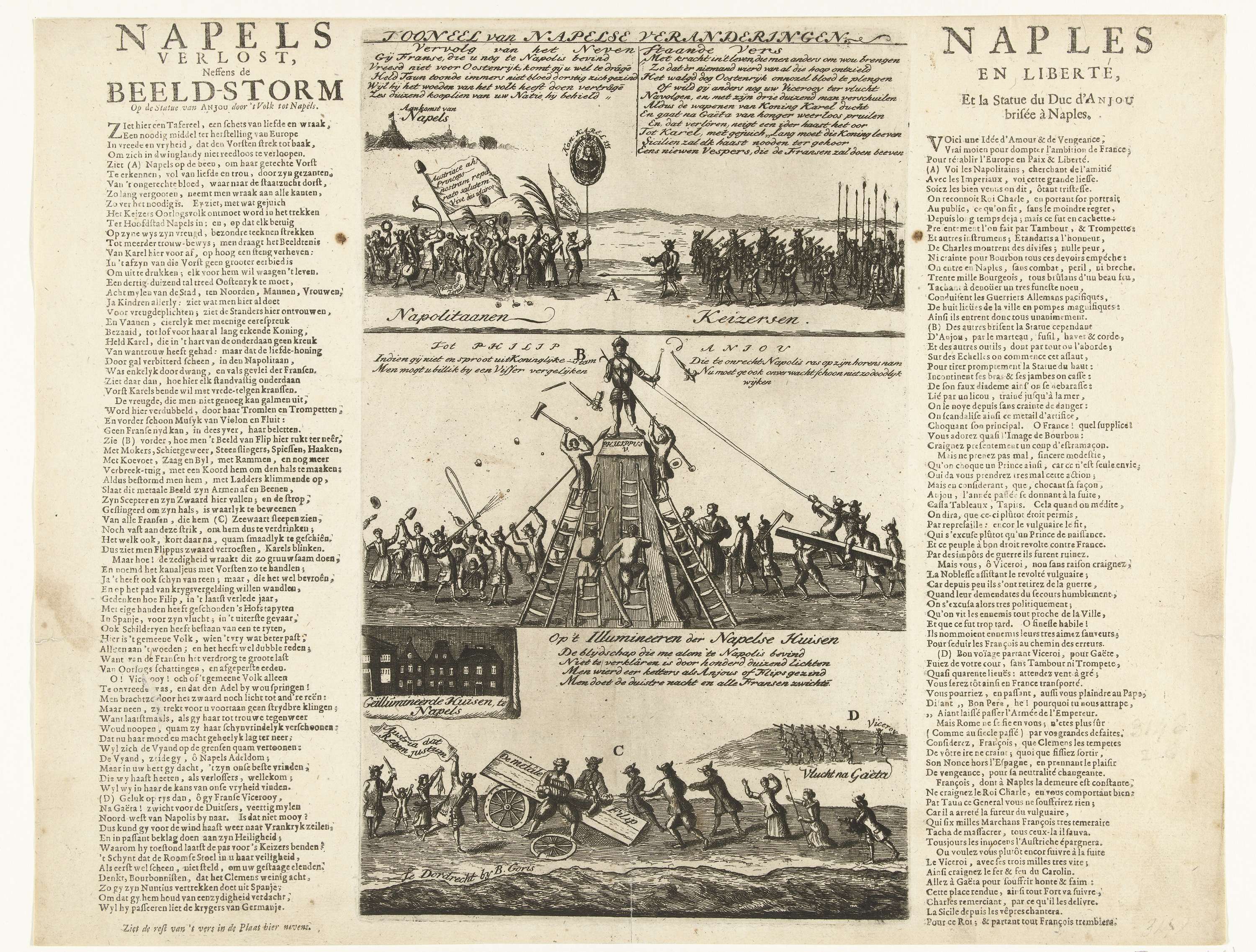 Omwentelingen te Napels ten gunste van Karel III (keizer Karel VI). Plaat met drie voorstellingen. Boven: de Napolitanen komen de keizerlijke troepen tegemoet. Midden: afbreken van het standbeeld van de hertog van Anjou (Filips V) te Napels. Onder: wegvoeren van de stukken van het beeld en verlichte huizen te Napels. Op het blad aan weerszijden ...