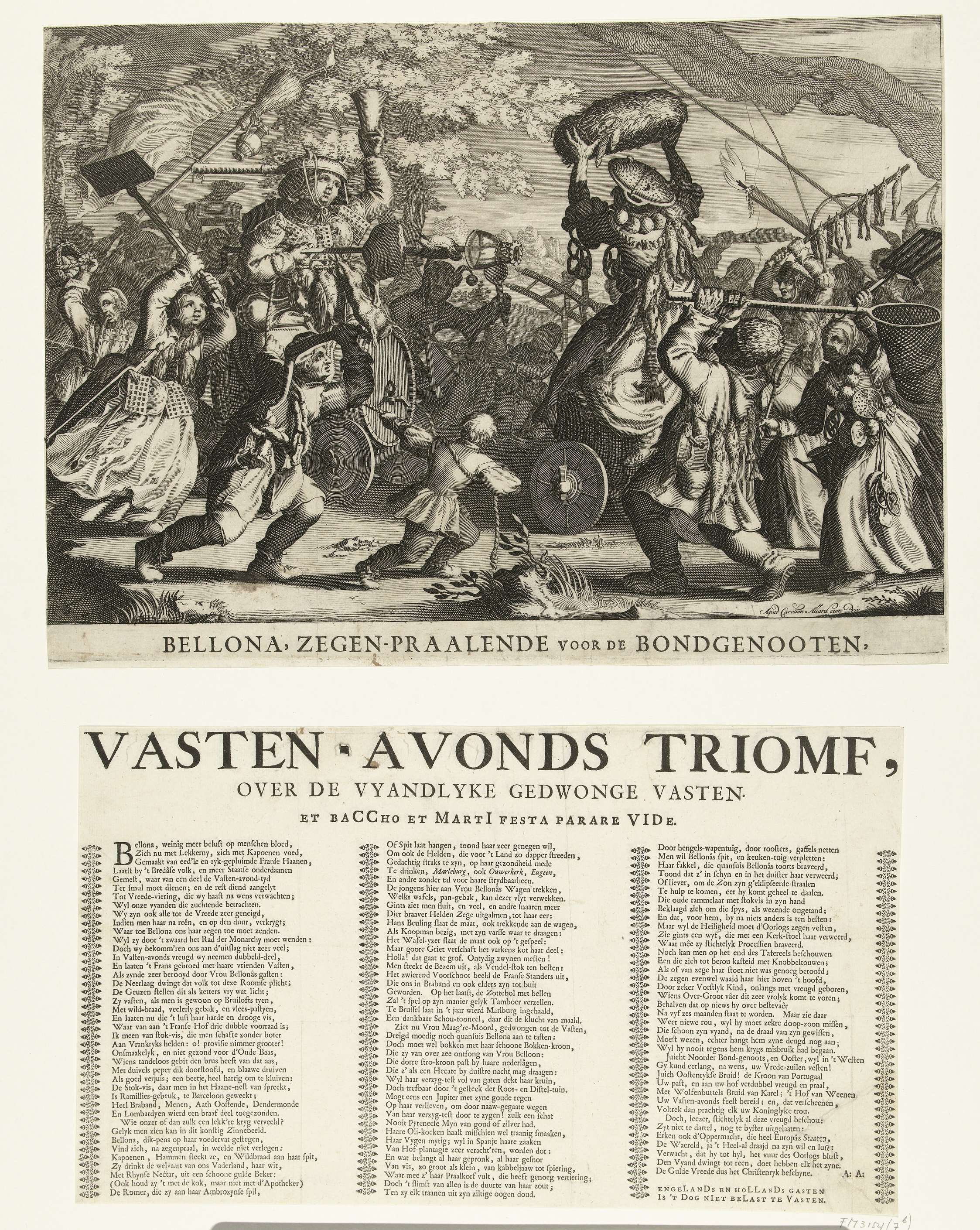Spotprent met de strijd tussen Vastenavond en Vasten geplaatst in de context van de Spaanse Successieoorlog, 1707. Strijd tussen twee personen op strijdwagens getrokken door kinderen. Links Vastenavond, aangekleed met keukeninstrumenten, wild en gevogelte, drinkglazen en kannen. Rechts Vasten, aangekleed met vissen en krakelingen. Bij de voorstelling is ook een tekstblad met een Nederlands vers ...