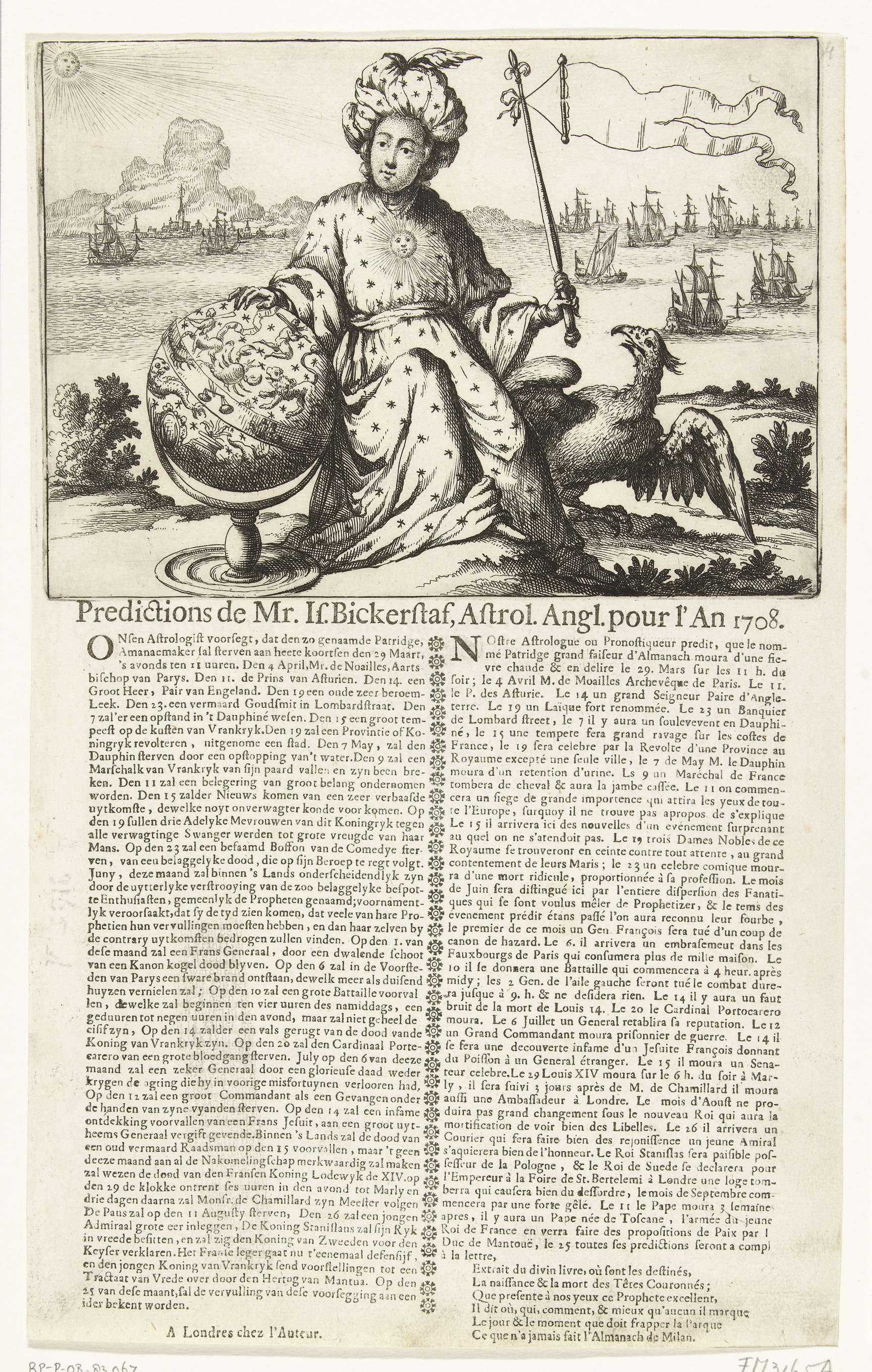 Spotprent met de voorspellingen van de Engelse astroloog Mr. Bickerstaf voor het jaar 1708. De astroloog met tulband en staf zittend tussen een hemelglobe met de sterrenbeelden en een adelaar. Onderdeel van een reeks getiteld Palmhof der Bondgenooten met 9 spotprenten op de Fransen en bondgenoten uit het jaar 1708.