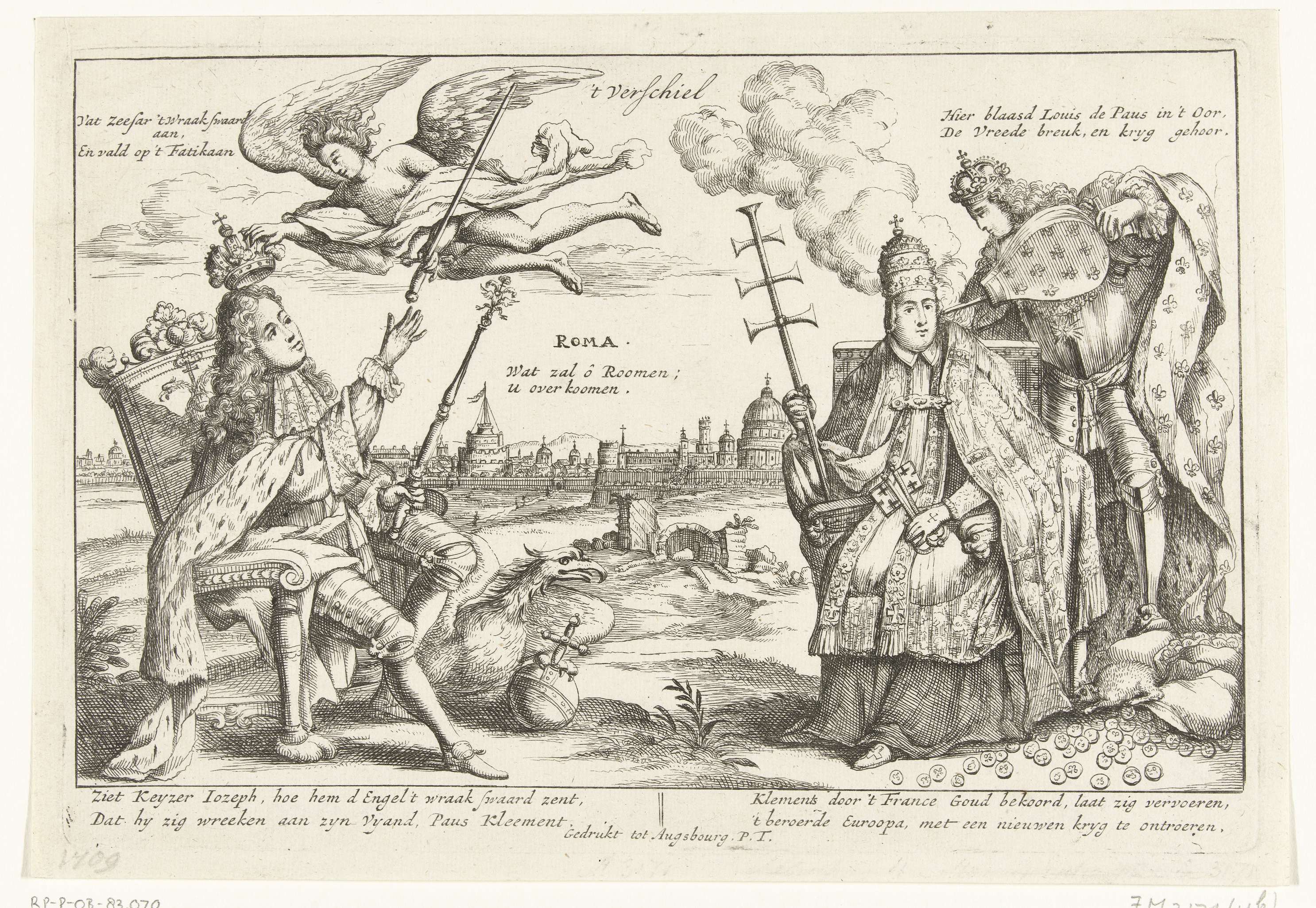 Spotprent waarin keizer Jozef I van een engel het zwaard van de wraak krijgt aangereikt. Tegenover hem blaast koning Lodewijk XIV van Frankrijk met een blaasbalg in het oor van paus Clemens XI. Op de achtergrond Rome. Verzen in de plaat in het Nederlands. Onderdeel van een reeks getiteld Palmhof der Bondgenooten met 9 spotprenten ...