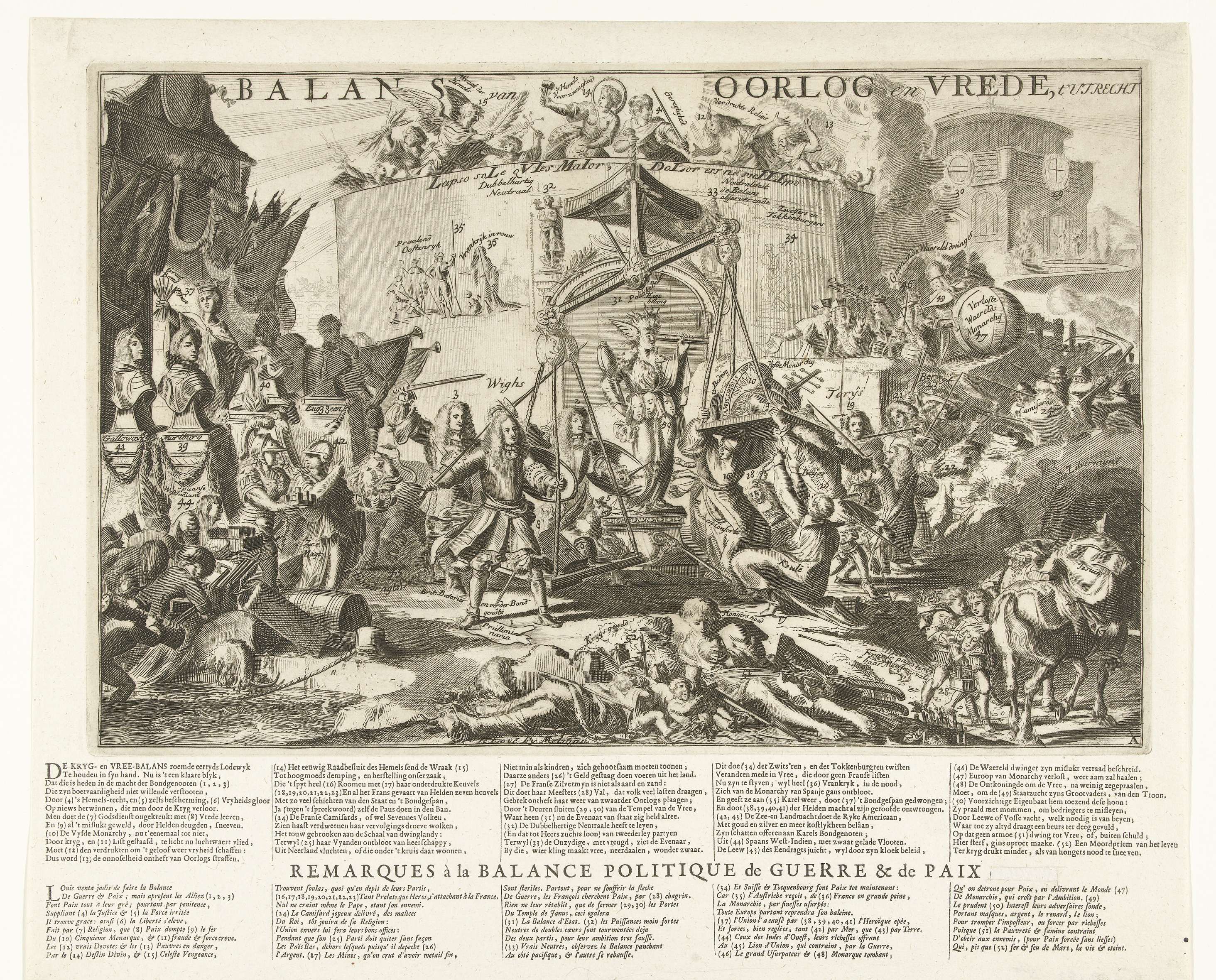 Allegorische voorstelling over de toestand in Europa tijdens de Spaanse Successieoorlog in het jaar 1709 met centraal een grote weegschaal waarin de Oorlog en Vrede tegen elkaar worden gewogen. Tegenover elkaar staan ook de Engelse partijen van de Whigs en de Tories. Op de voorgrond onschuldige slachtoffers van de oorlog. Gemerkt rechtsonder: A. Op het ...