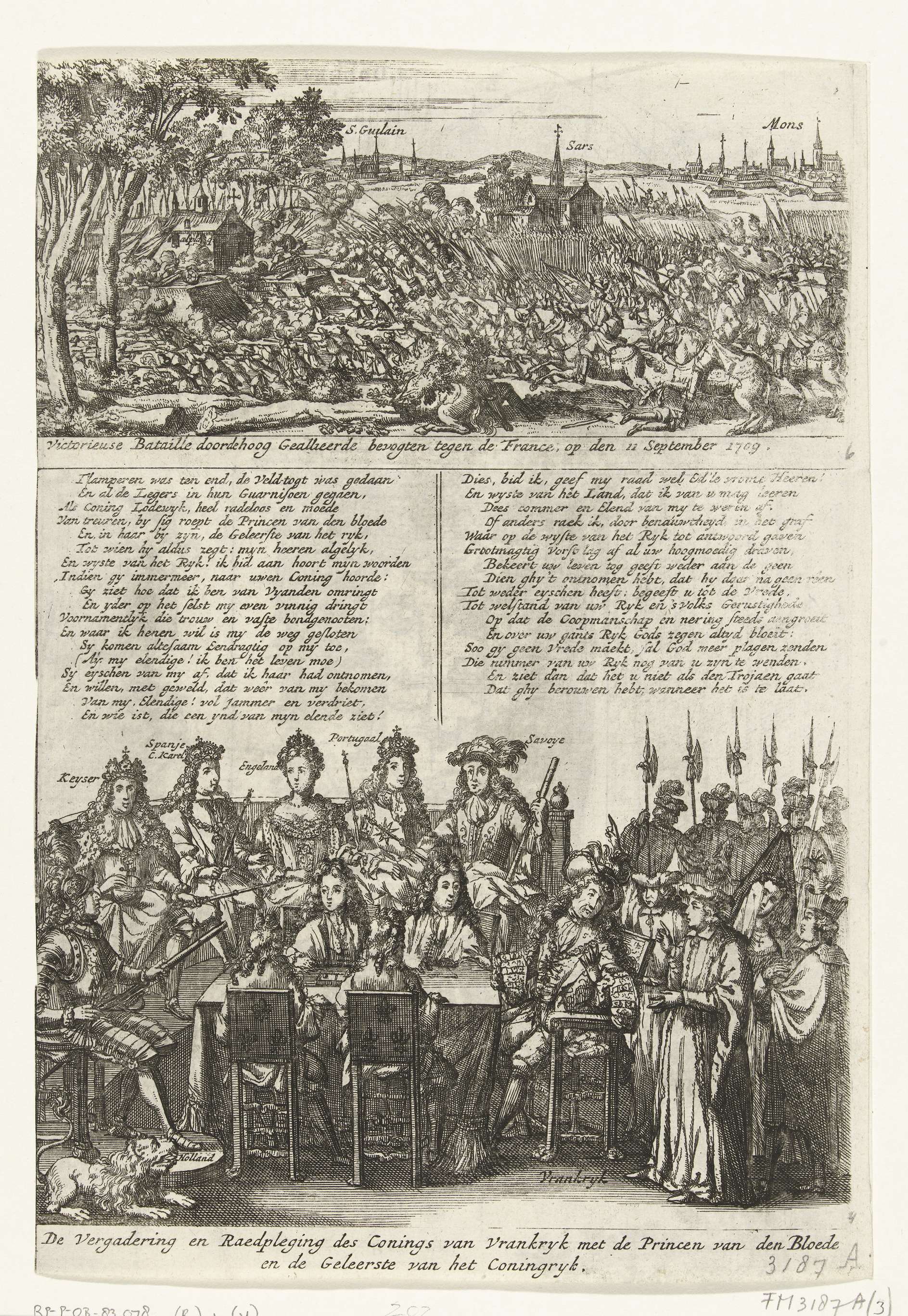 Voorzijde van een blad met twee voorstellingen uit het jaar 1709. Boven de slag bij Malplaquet, onder koning Lodewijk XIV in beraad, de vorsten van de geallieerden kijken toe. Hiertussen een vers in twee kolommen in het Nederlands. Onderdeel van een reeks getiteld Vorstelyke Staat-Balans met 7 spotprenten (plus varianten) op de Fransen uit het ...