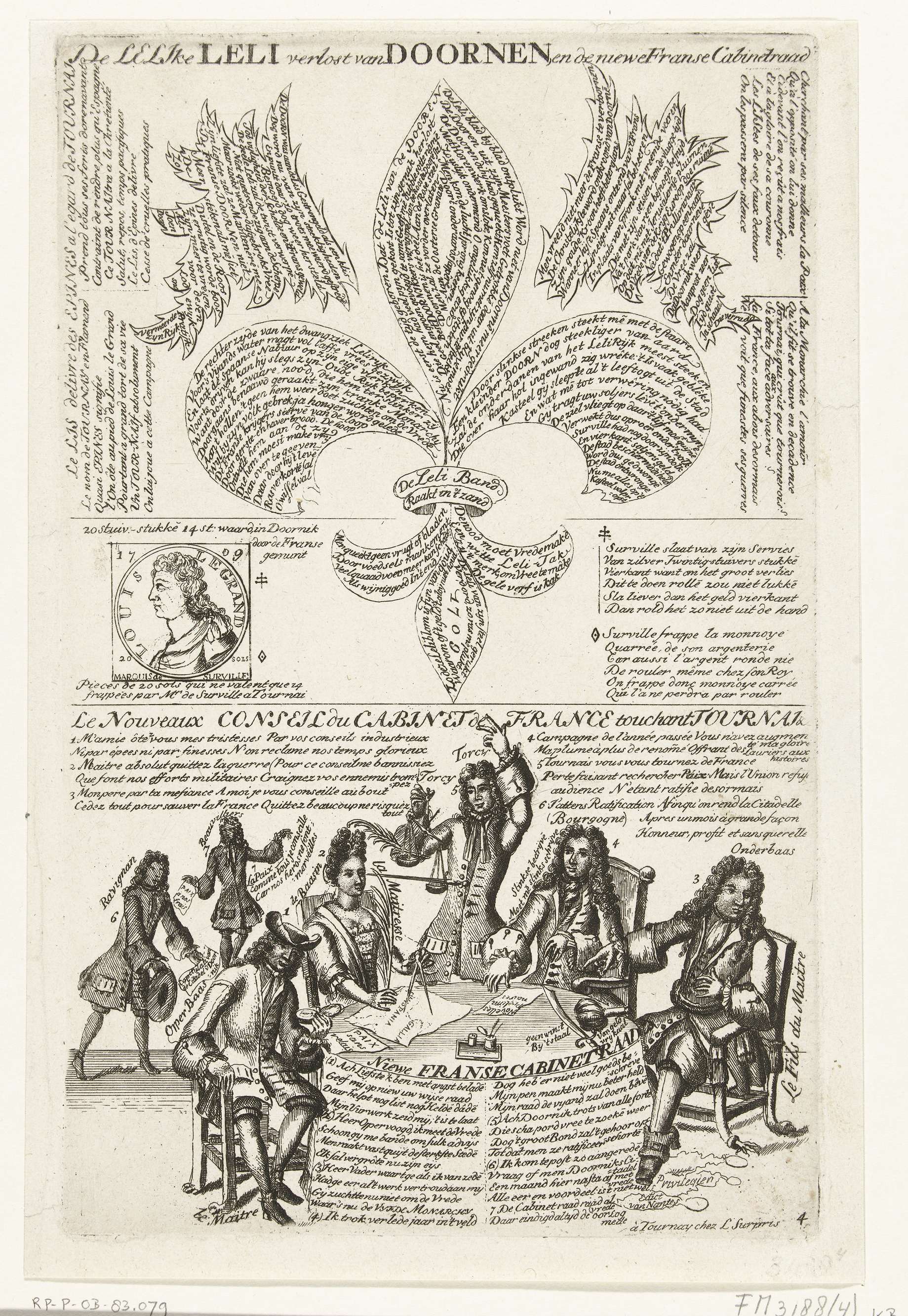 Spotprent op het Franse verlies van Doornik aan de geallieerden in 1709. Boven een Franse lelie ontdaan van doornen, onder een beraad van het Franse kabinet. Met opschriften en verzen in microschrift in het Nederlands en Frans. Genummerd rechtsonder: 4. Onderdeel van een reeks getiteld Vorstelyke Staat-Balans met 7 spotprenten (plus varianten) op de Fransen ...