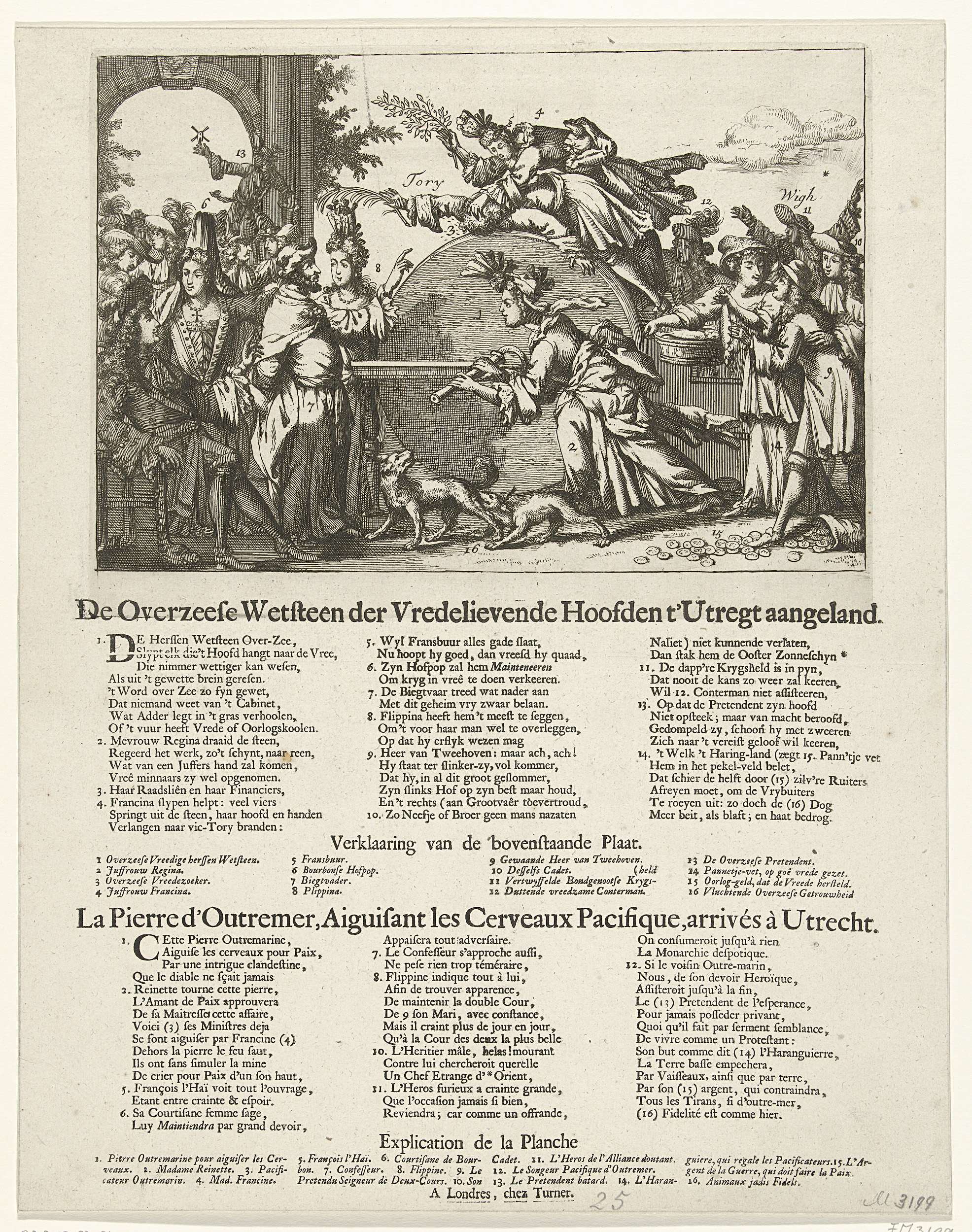 Spotprent op de Vrede van Utrecht, 1713. Op een grote slijpsteen aangedreven door koningin Anna wordt het hoofd van een Tory geslepen, links kijkt het Franse hof toe. Op het blad verzen en uitleg in het Nederlands en Frans. Onderdeel van een groep van 31 spotprenten over de Vrede van Utrecht in 1713.