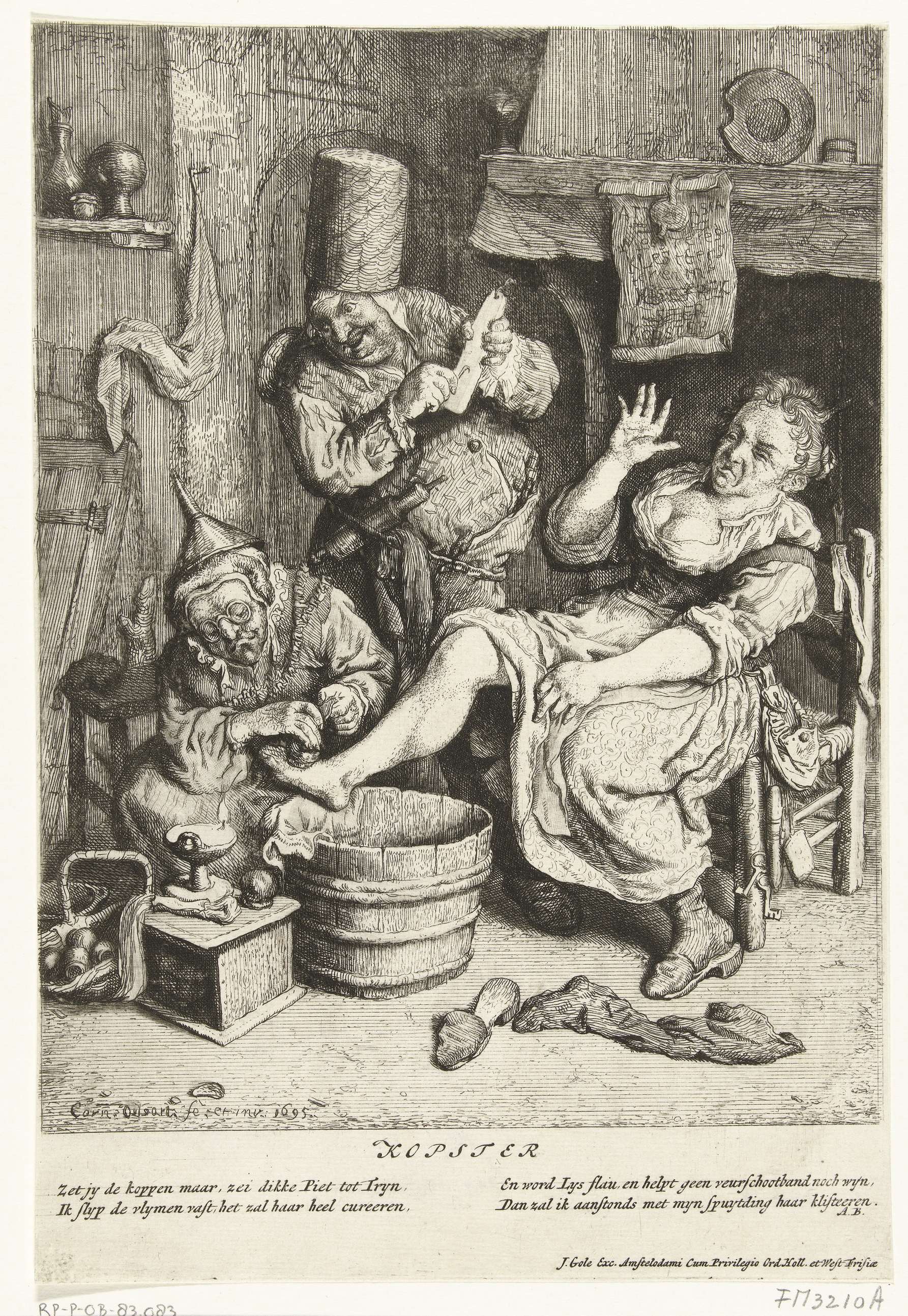 Interieur waarin een kopster het been van een zittende vrouw behandelt. Een man kijkt toe. Met onderschrift van vier regels in het Nederlands. Het voorbeeld voor een prent in de groep van 31 spotprenten over de Vrede van Utrecht in 1713.