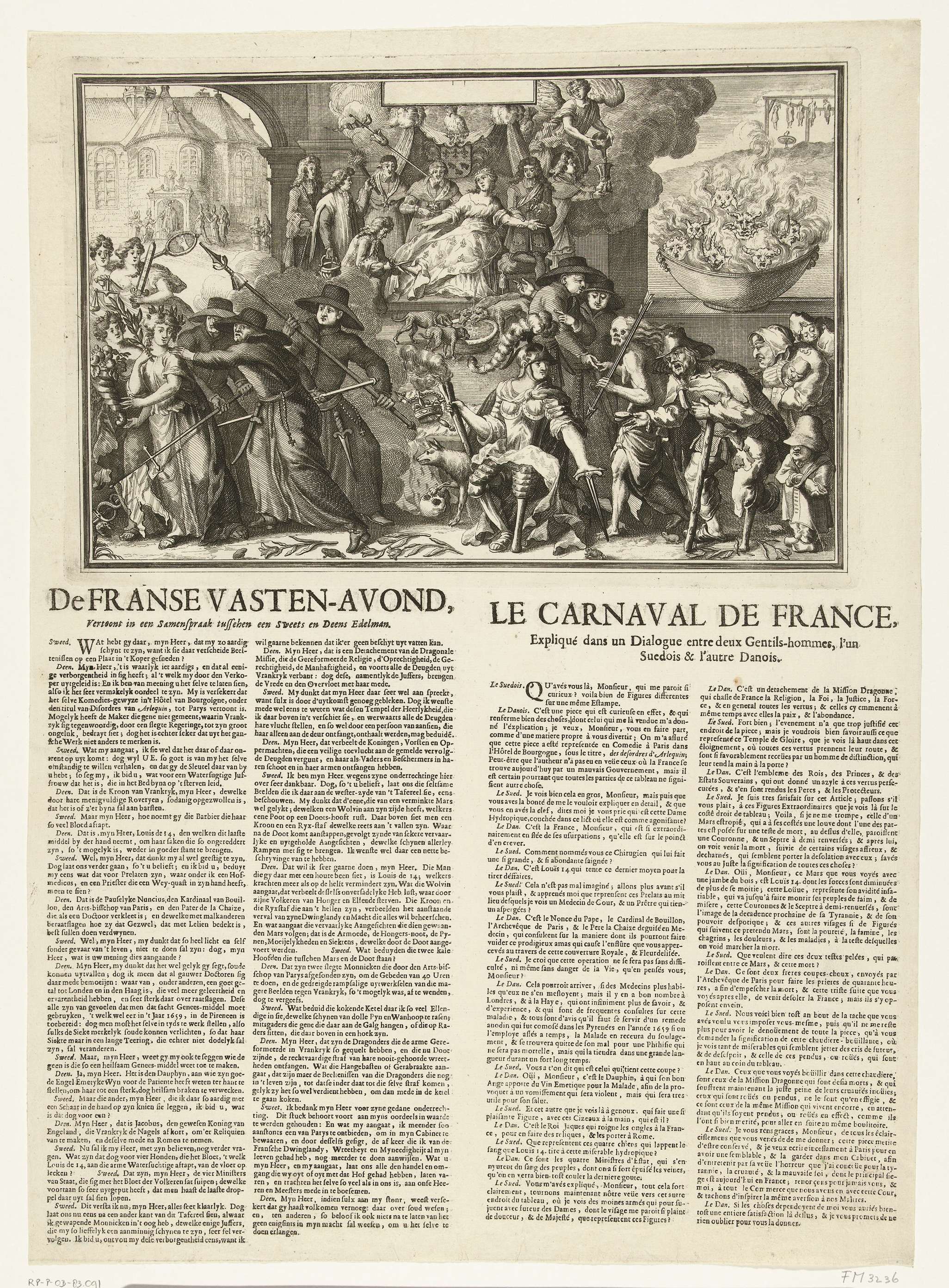 De Franse Vastenavond. Allegorie op de dragonades in Frankrijk onder koning Lodewijk XIV. Links worden de deugden verjaagd door jezuïeten, ze vluchten naar een tempel (de Republiek) waar ze welkom worden geheten. Centraal de aderlating van Frankrijk, het bloed wordt door honden opgelikt. Rechts Mars met een houten been met in zijn kielzog de Dood, ...
