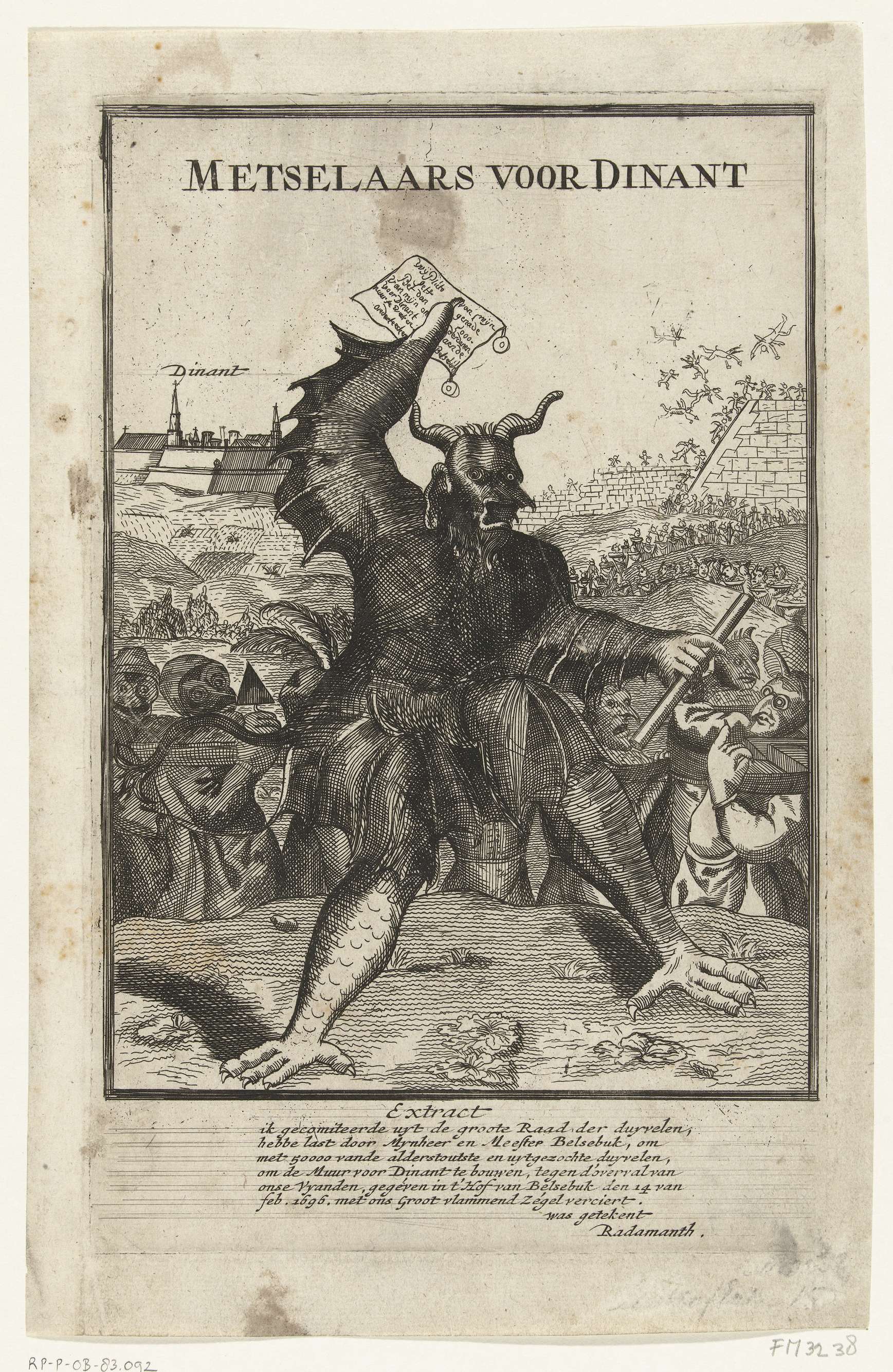Metselaars voor Dinant. Een grote duivel roept andere duivels op om als metselaars de versterkingen van de Franse stad Dinant te helpen wederopbouwen. In de hand een door de duivel verzegeld document met (volgens het onderschrift) datum 14 februari 1696. In het onderschrift een vers in het Nederlands. Ondanks de verwijzing naar het jaar 1696 ...