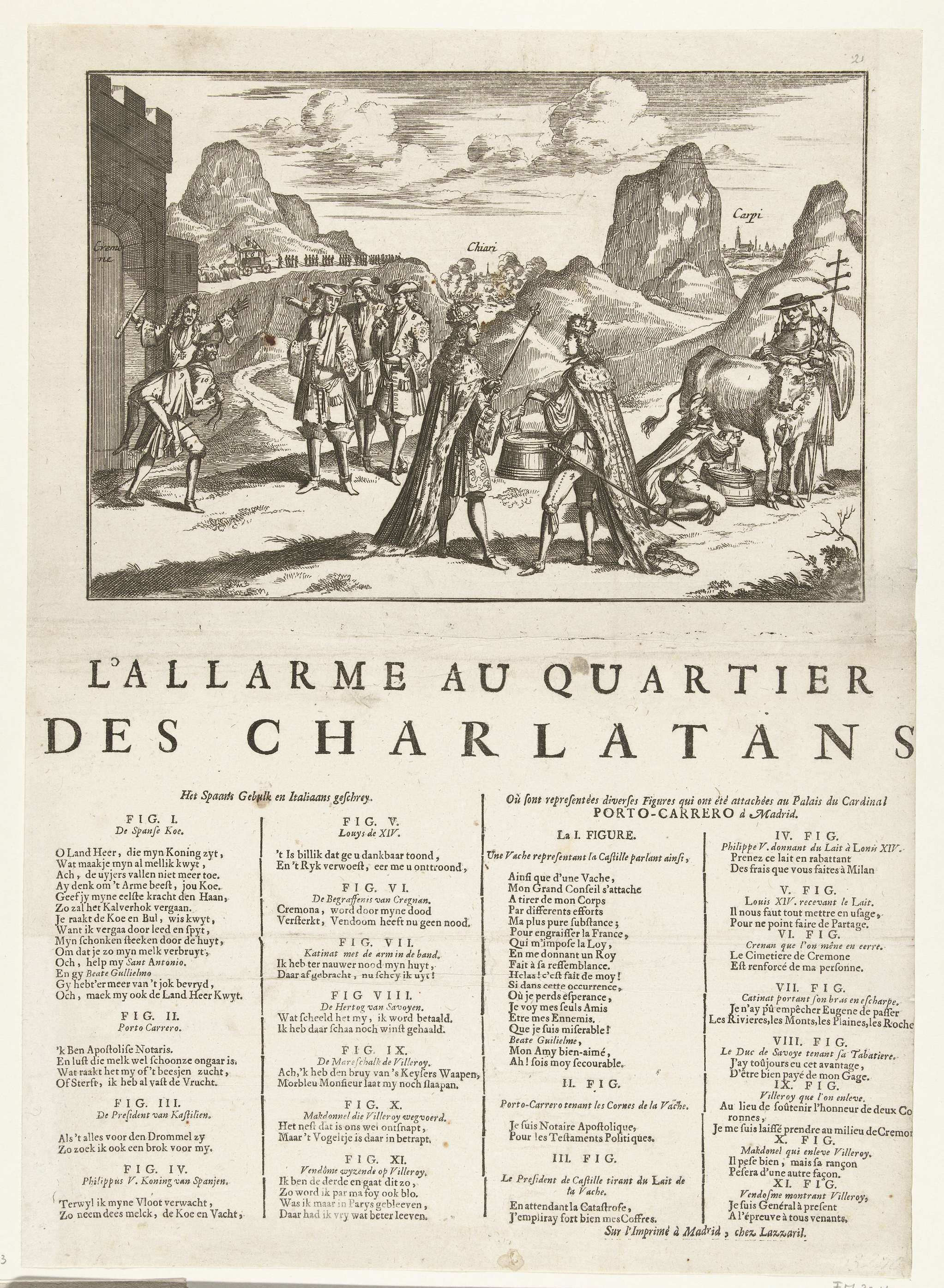 Allegorie waarin de kardinaal Portocarrero de Spaanse koe laat melken door de president van Castilië, Filips V geeft de melk aan Lodewijk XIV. Op het blad onder de plaat verzen in het Nederlands en Frans. Onderdeel van een groep afzonderlijke spotprenten op Lodewijk XIV tijdens de Spaanse Successieoorlog, ca. 1701-1713.