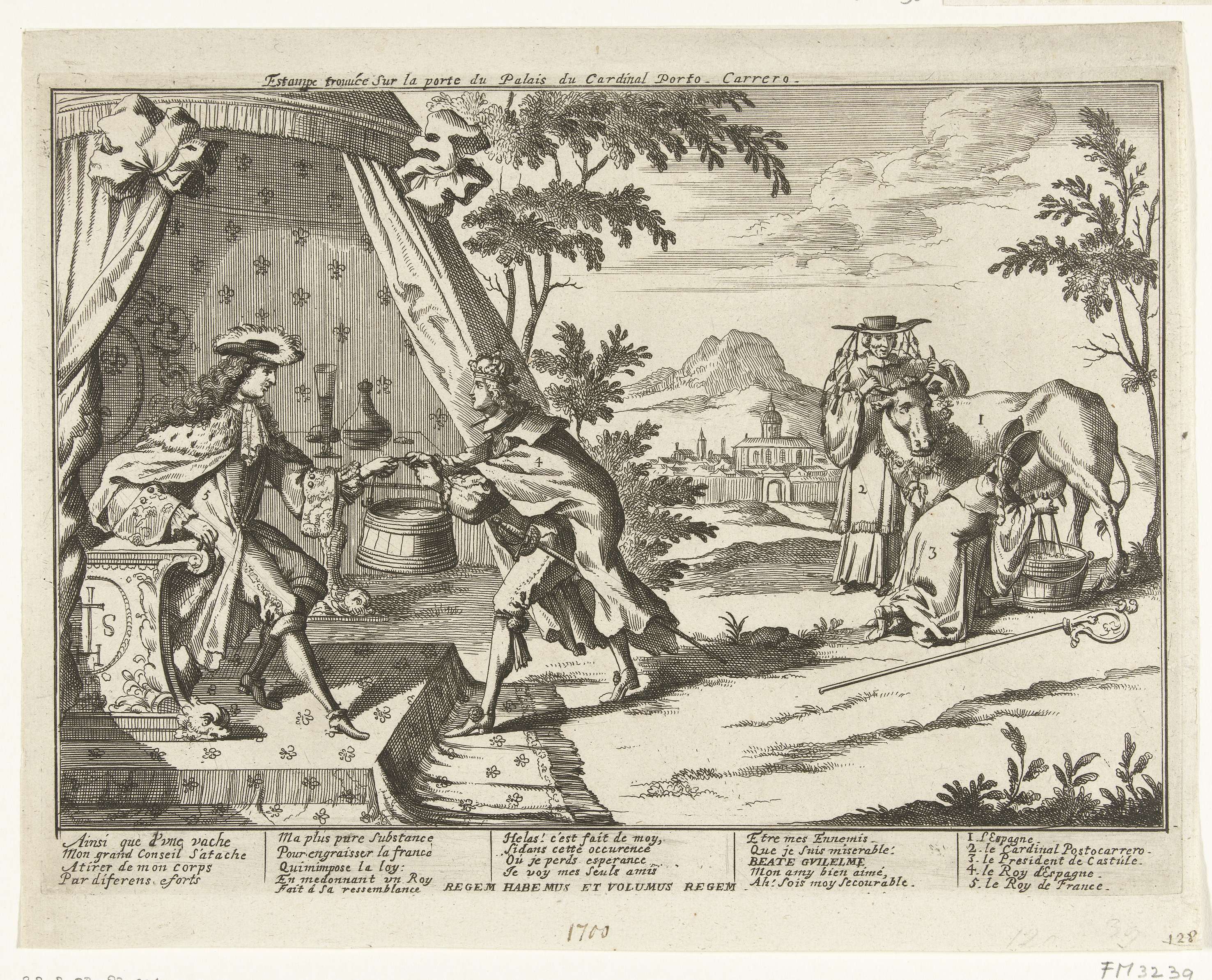 Allegorie waarin de kardinaal Portocarrero de Spaanse koe laat melken door de president van Castilië. Filips V geeft de melk aan Lodewijk XIV die links in een tent zit. In het onderschrift verzen en legenda in het Frans. Vermeld bovenaan: Estampe trouvée sur la porte du Palais du Cardinal Porto-Carrero. Onderdeel van een groep afzonderlijke ...
