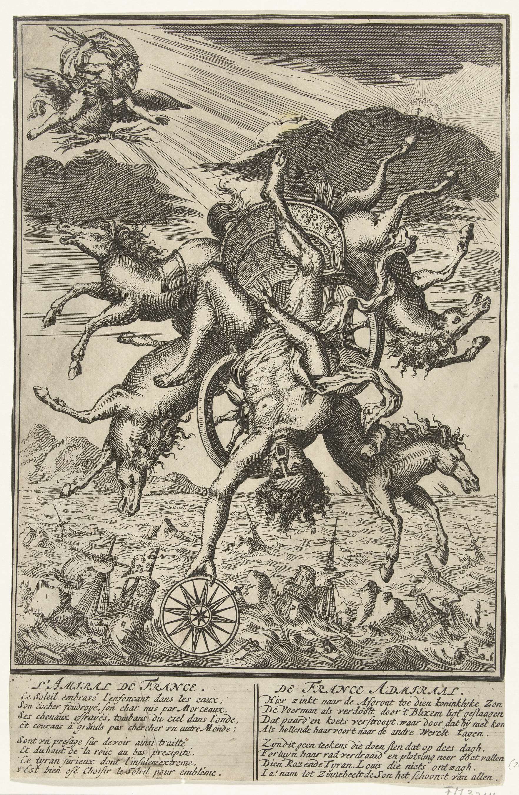 De Franse Admiraal. Spotprent op de verbranden van de Franse en Spaanse schepen door de Hollanders en Engelsen na de overwinning in de zeeslag in de baai van Vigo, 23 oktober 1702. Phaëthon valt met de zonnewagen uit de hemel in de zee. In het onderschrift twee verzen in het Frans en Nederlands. Onderdeel van ...