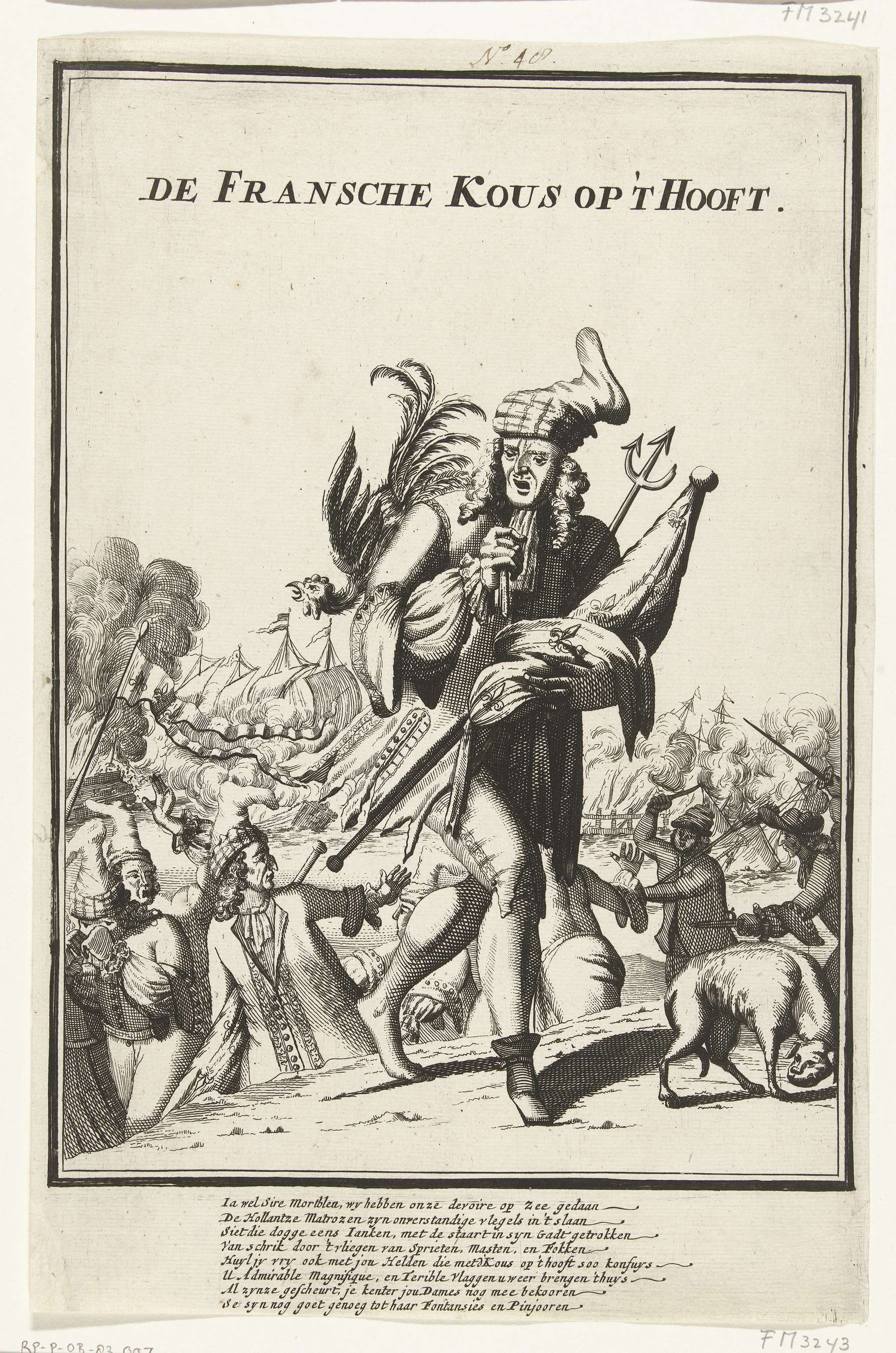 Spotprent op de Franse nederlaag tegen een gecombineerde Engels-Hollandse vloot in de zeeslag in de baai van Vigo, 23 oktober 1702. Franse matrozen vluchten met een kous op de kop. Met onderschrift van 8 regels in het Nederlands. Onderdeel van een groep afzonderlijke spotprenten op Lodewijk XIV tijdens de Spaanse Successieoorlog, ca. 1701-1713.