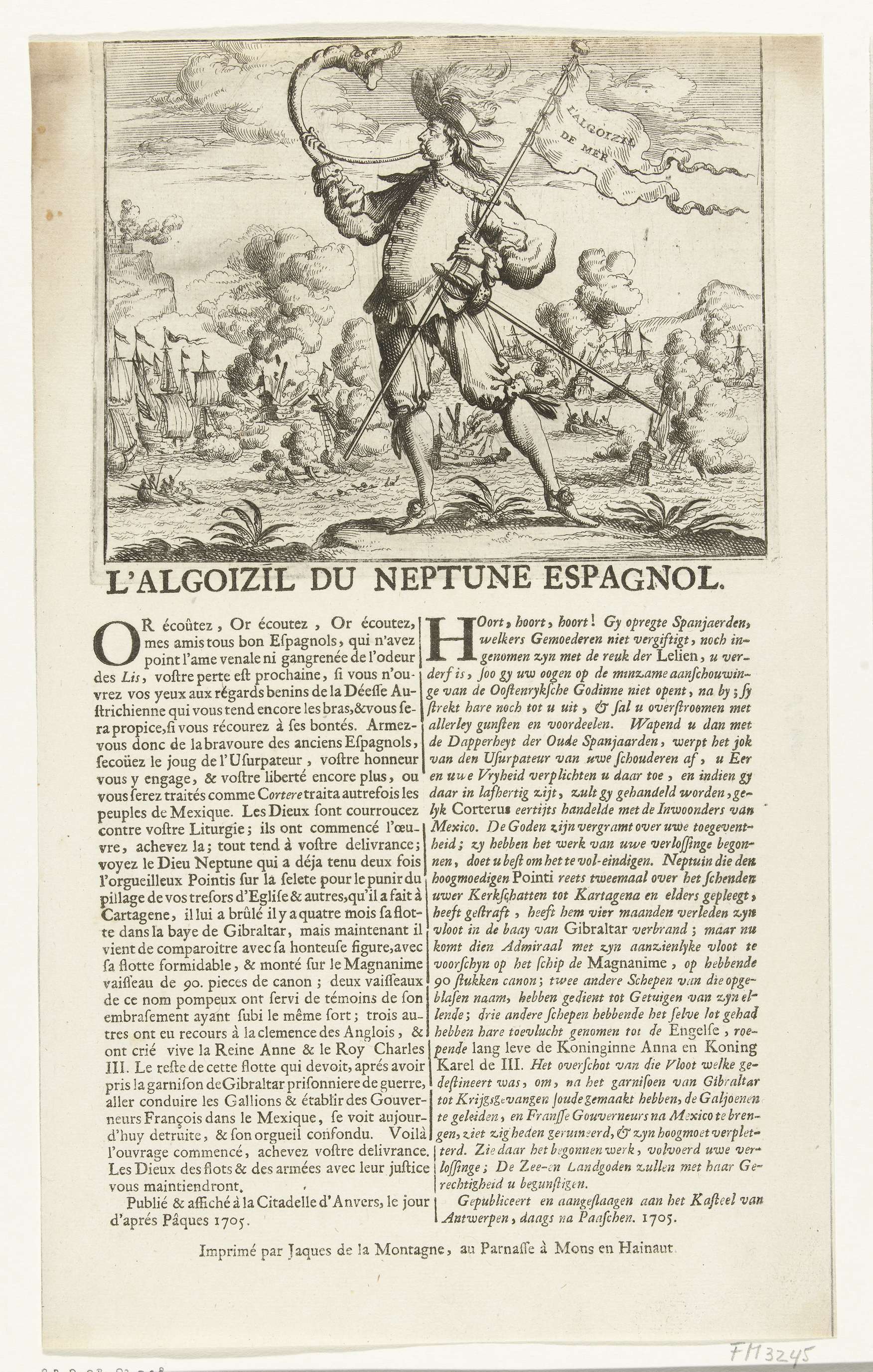 Spotprent op een Franse nederlaag in een niet nader geduide zeeslag (bij Gibraltar?) in het jaar 1705. Op de voorgrond een vaandeldrager blazend op een hoorn, op de achtergrond de zeeslag. Op het blad onder de plaat teksten in het Frans en Nederlands. Vermeld in de tekst: Gepubliceert en aangeslaagen aan het Kasteel van Antwerpen, ...