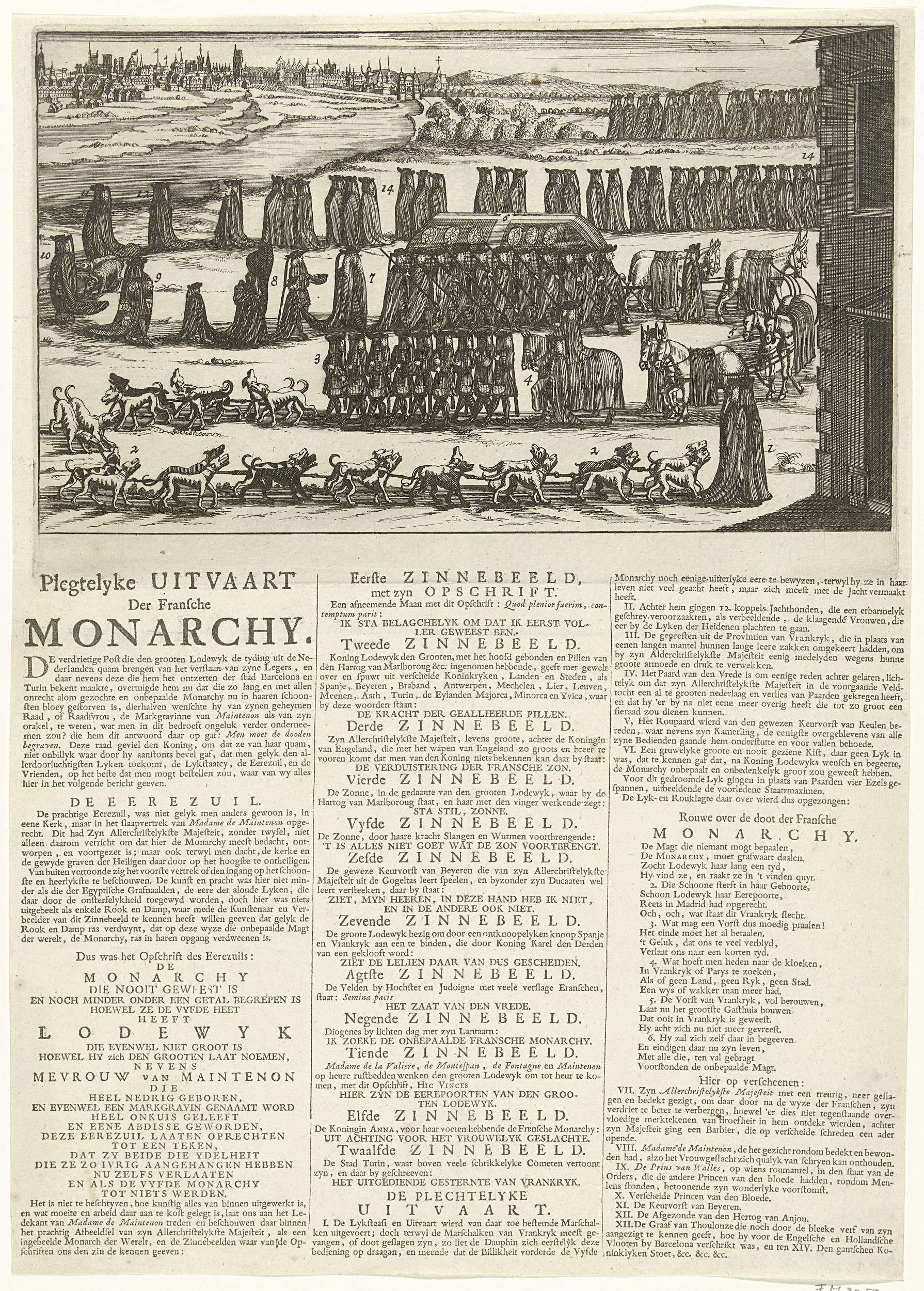 Spotprent op de Franse verliezen in het jaar 1706 (Barcelona en Turijn): begrafenis van de Franse plannen voor wereldheerschappij. De Franse monarchie wordt ten grave gedragen in een lange begrafenisstoet. Op het blad onder de plaat 3 kolommen tekst in het Nederlands. Onderdeel van een groep afzonderlijke spotprenten op Lodewijk XIV tijdens de Spaanse Successieoorlog, ...