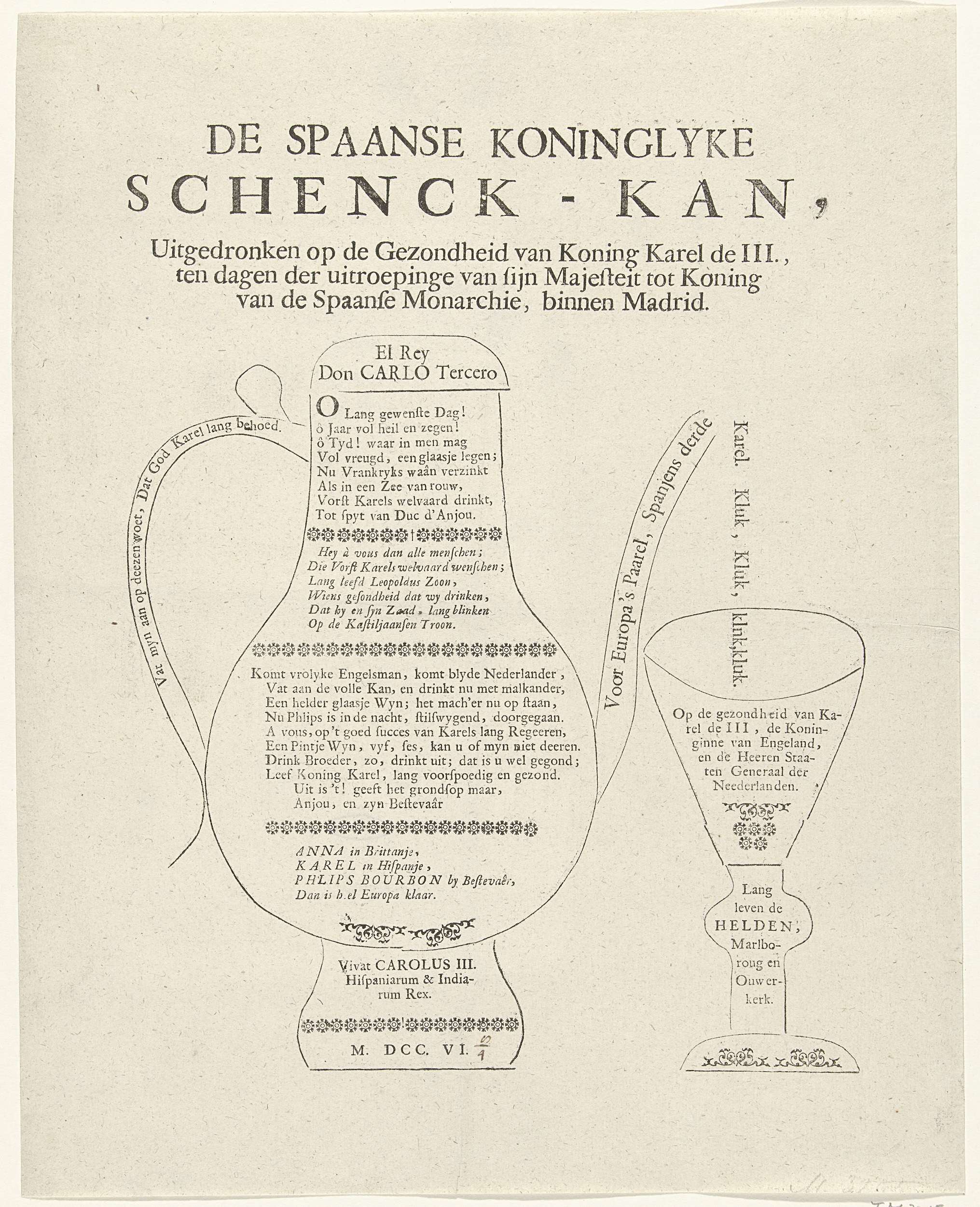 Een schenkkan en een glas waarop opschriften staan ter ere van Karel III als koning van Spanje. Onderdeel van een groep afzonderlijke spotprenten op Lodewijk XIV tijdens de Spaanse Successieoorlog, ca. 1701-1713.