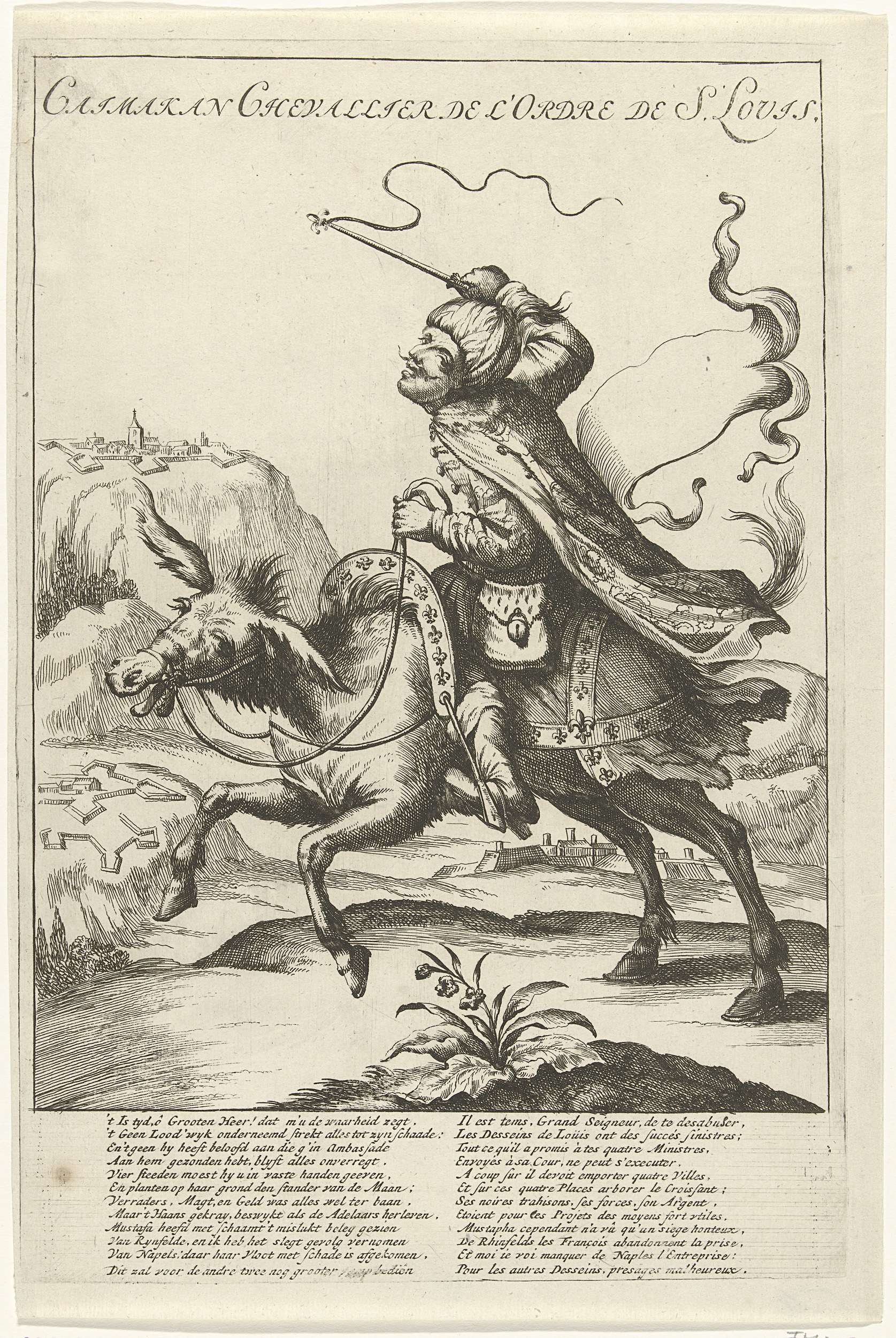 Turkse bode Caimakan rijdend op een ezel om de sultan het nieuws te brengen van de Franse verliezen in 1707 bij Rheinfels en Napels. In het onderschrift verzen in het Nederlands en Frans. Onderdeel van een groep afzonderlijke spotprenten op Lodewijk XIV tijdens de Spaanse Successieoorlog, ca. 1701-1713.