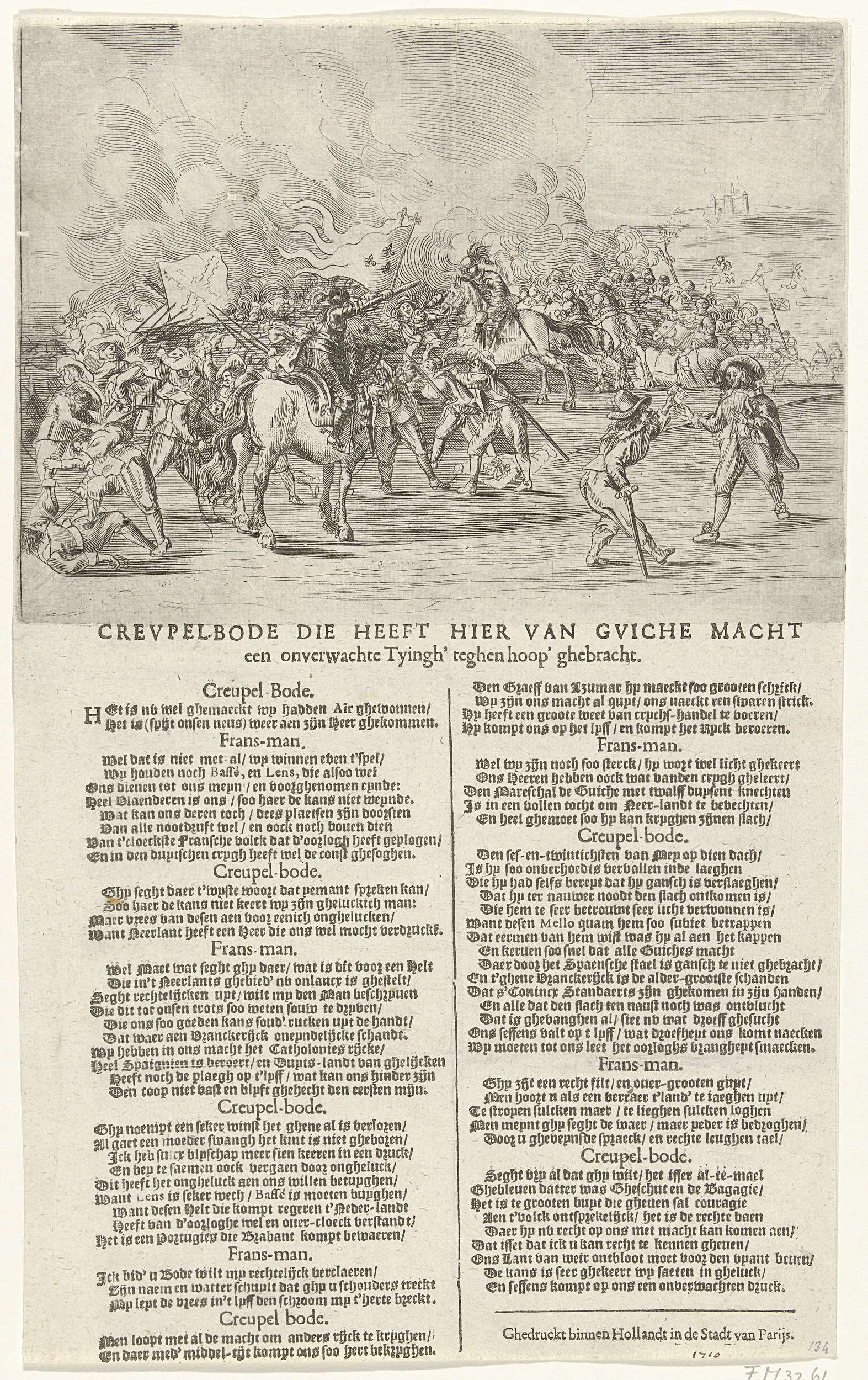 Spotprent op het Franse verlies van Aire, 8 november 1710. Veldslag, links overhandigt de ‘kreupele’ bode met loopstok een brief aan een Franse officier. Onderdeel van een groep afzonderlijke spotprenten op Lodewijk XIV tijdens de Spaanse Successieoorlog, ca. 1701-1713.