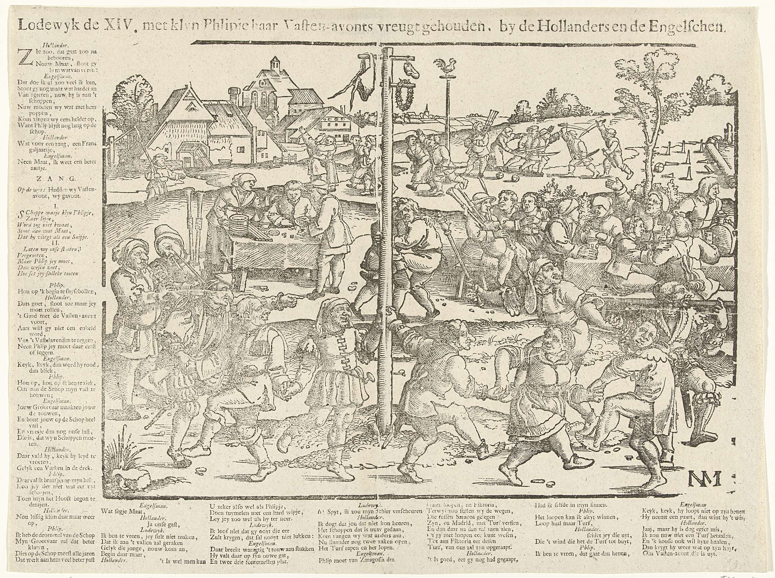 Lodewijk XIV en Filips V vieren Vastenavond bij de Hollanders en Engelsen, 1710. Oude houtsnede van een boerendans met feestmaal en vechtpartijen, bekend als de Neuzendans. Links en onder de voorstelling verzen in het Nederlands. Onderdeel van een groep afzonderlijke spotprenten op Lodewijk XIV tijdens de Spaanse Successieoorlog, ca. 1701-1713.