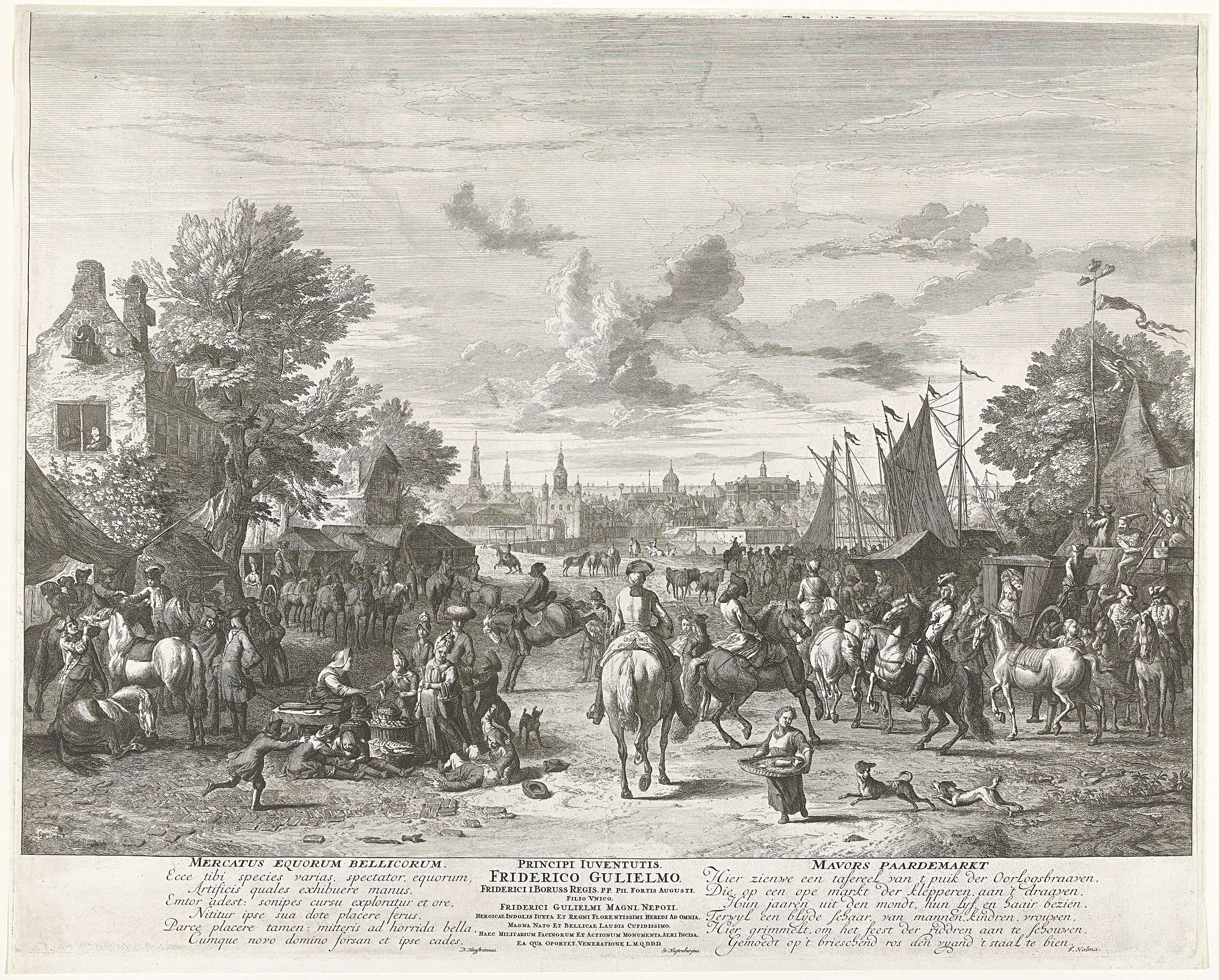 Gezicht op een paardenmarkt buiten een stad waar officieren paarden kopen. ook met vrouwen en spelende kinderen, rechts een toneelvoorstelling. Ten tijde van de Spaanse Successieoorlog, ca. 1702. In het onderschriften verzen in het Latijn en Nederlands. In het midden de opdracht aan de jonge prins Frederik Willem in het Latijn.