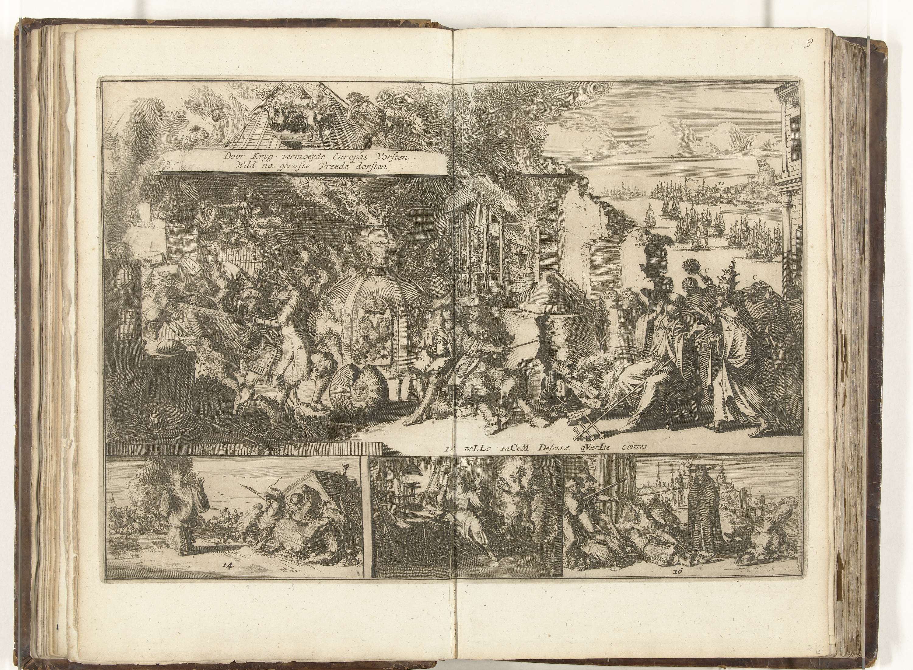 Spotprent waarin de geallieerde Europese vorsten het Stookhuis of Fornuis van de Oorlog in de Alchemistenwerkplaats van koning Lodewijk XIV en de paus en kardinaal aan stukken slaan, 1706. Met onderaan drie kleinere scènes. Blad nr. 3 in de serie van 25 bladen getiteld: Byvoegsel tot de Koninglyke Almanach, genaamd het Gulde-Jaar der Bondgenooten, 1706. ...
