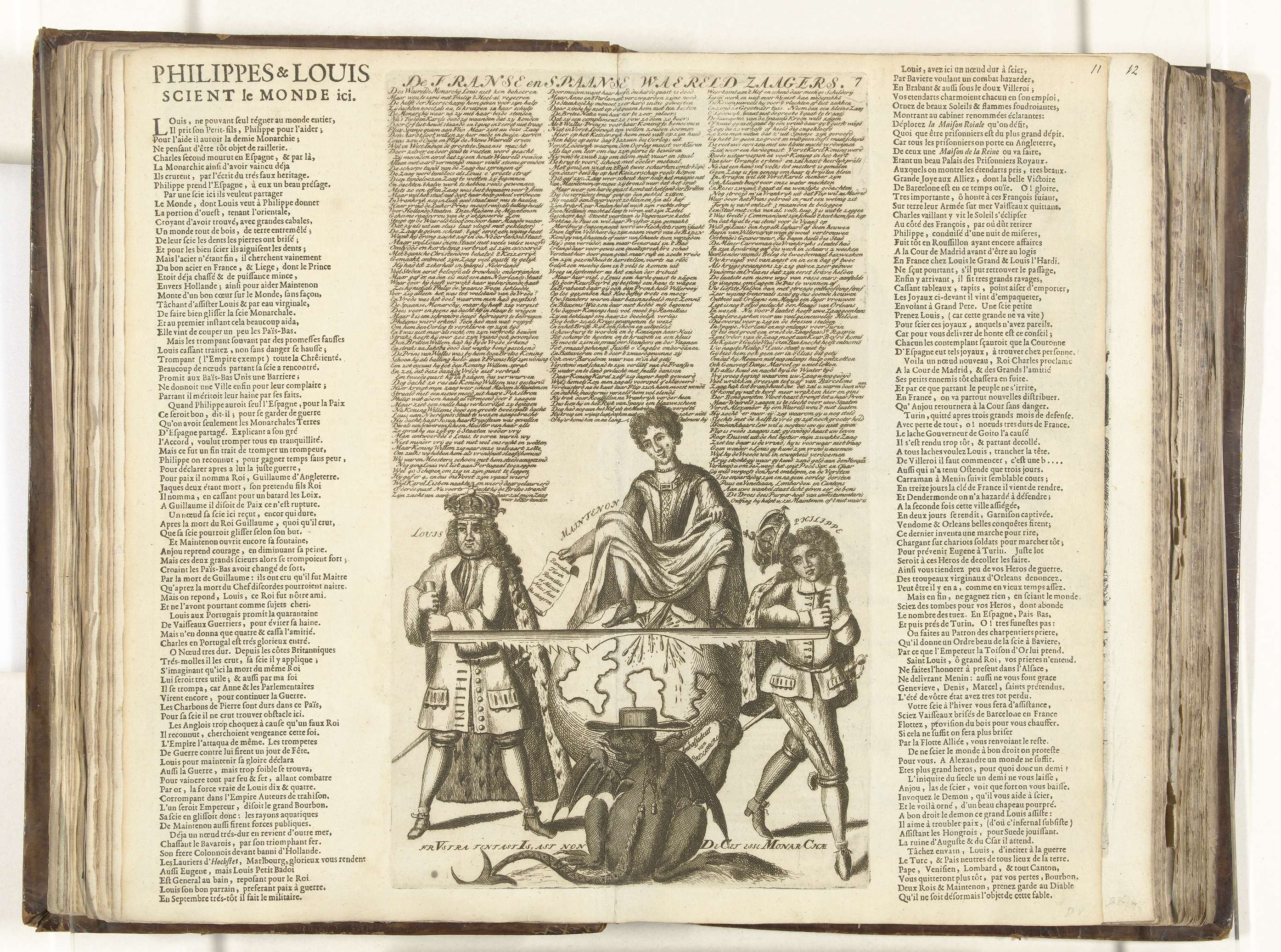 Spotprent op Lodewijk XIV en Filips V die met een grote zaag de wereld in tweeën proberen te zagen. Bovenop de wereldbol zit Madame de Maintenon die op de zaag plast om het blad te smeren. Op de voorgrond een duivel met kardinaalshoed van Portocarrero. In de plaat 3 kolommen in het Nederlands, op het ...