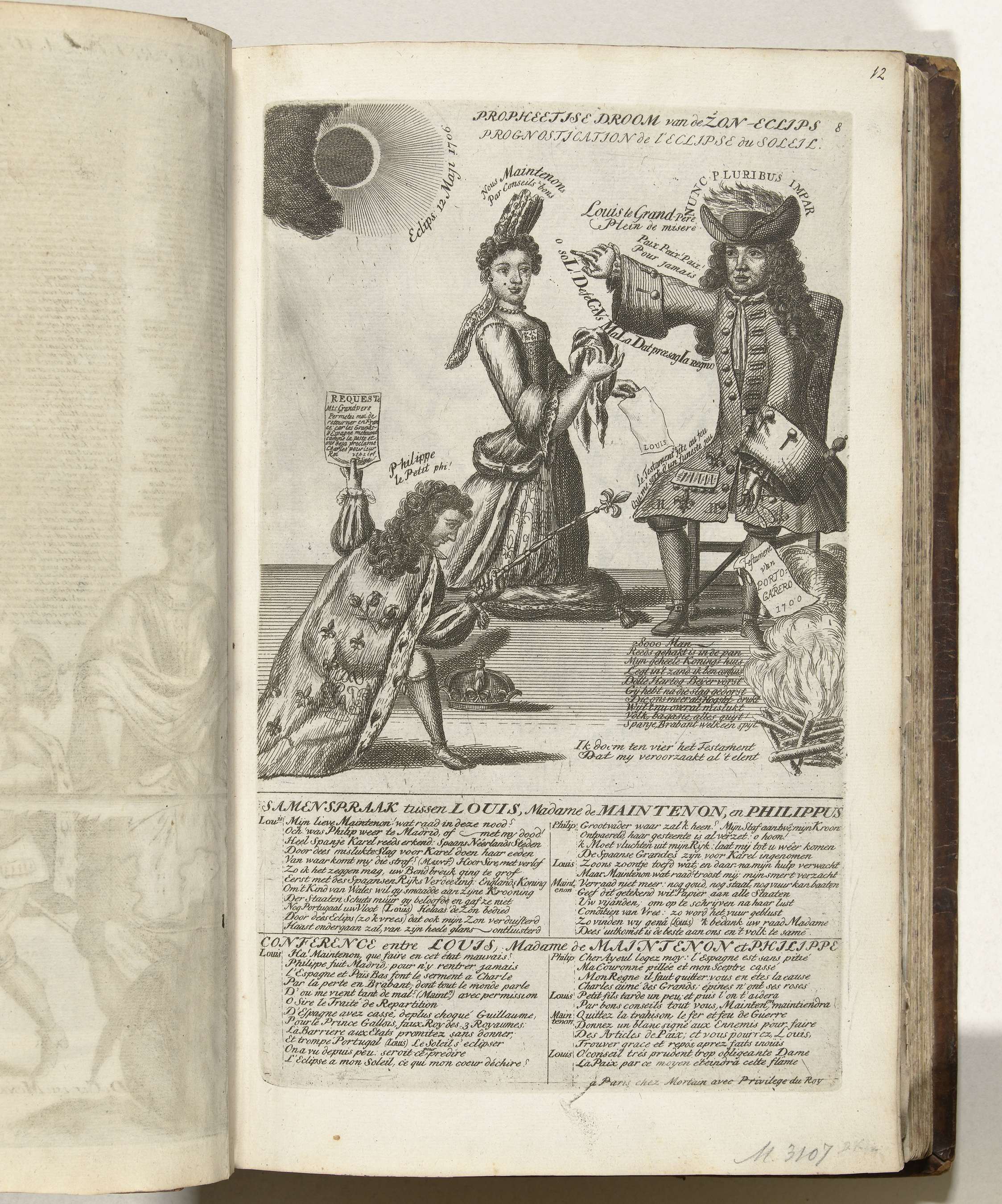 Madame de Maintenon en Filips V overhandigen knielend een verzoek aan Lodewijk XIV. Linksboven de zonsverduistering op 12 mei 1706 tijdens het verlies van Barcelona. In de plaat verzen in het Nederlands en Frans. In de plaat 2 kolommen in het Nederlands en Frans. Blad nr. 8 (genummerd rechtsboven) in de serie van 25 bladen ...