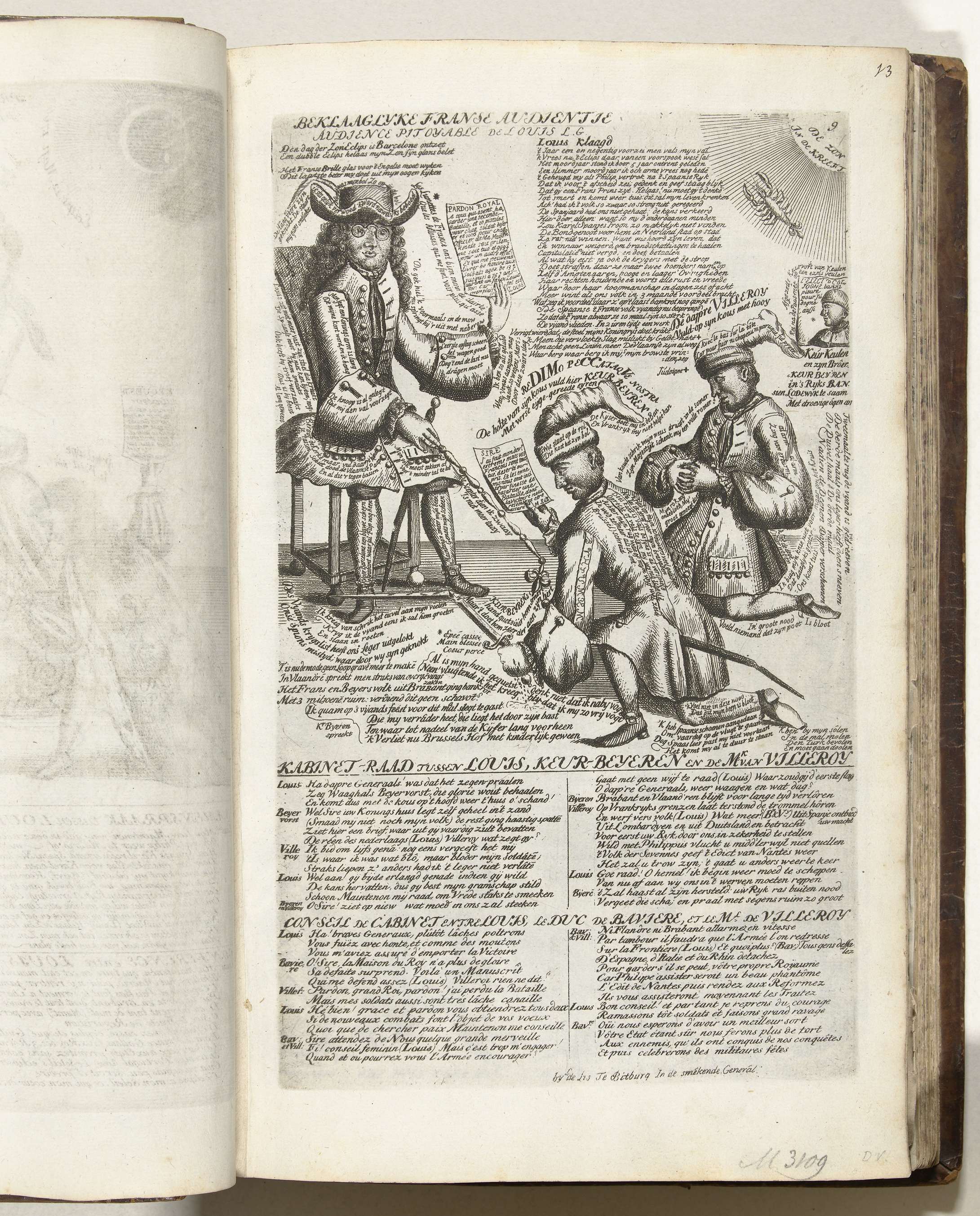 De hertog van Villeroy en Maximiliaan II Emanuel, de keurvorst van Beieren, knielen met de kous op de kop voor koning Lodewijk XIV. In de plaat 2 kolommen in het Nederlands en Frans. Blad nr. 9 (genummerd rechtsboven) in de serie van 25 bladen getiteld: Byvoegsel tot de Koninglyke Almanach, genaamd het Gulde-Jaar der Bondgenooten, ...
