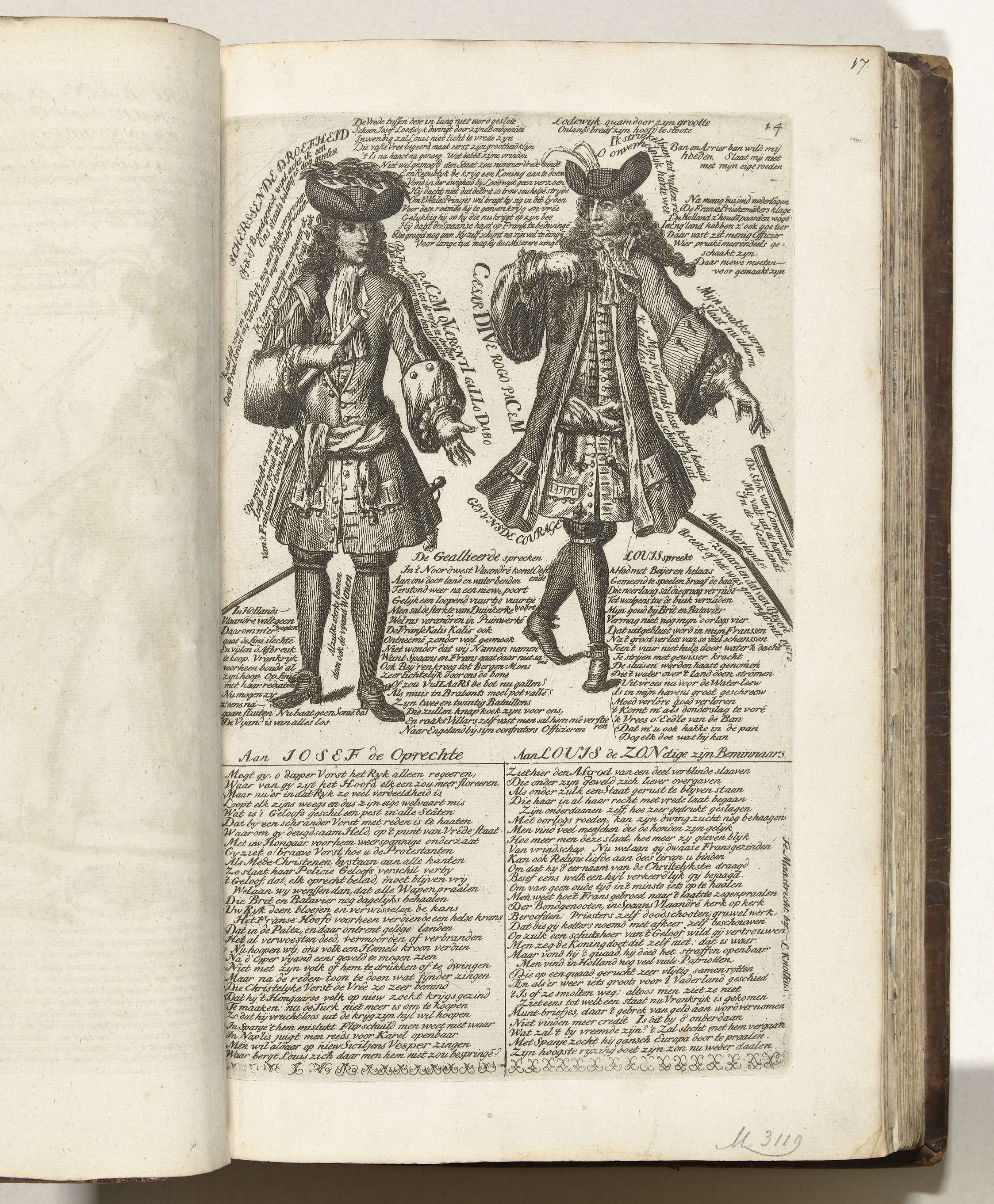Spotprent met een samenspraak tussen keizer Jozef I en koning Lodewijk XIV, 1706. In de plaat alle verzen en opschriften in het Nederlands. Blad nr. 14 (genummerd rechtsboven) in de serie van 25 bladen getiteld: Byvoegsel tot de Koninglyke Almanach, genaamd het Gulde-Jaar der Bondgenooten, 1706. Onderdeel van het prentwerk uitgegeven onder de verzameltitel: 't ...
